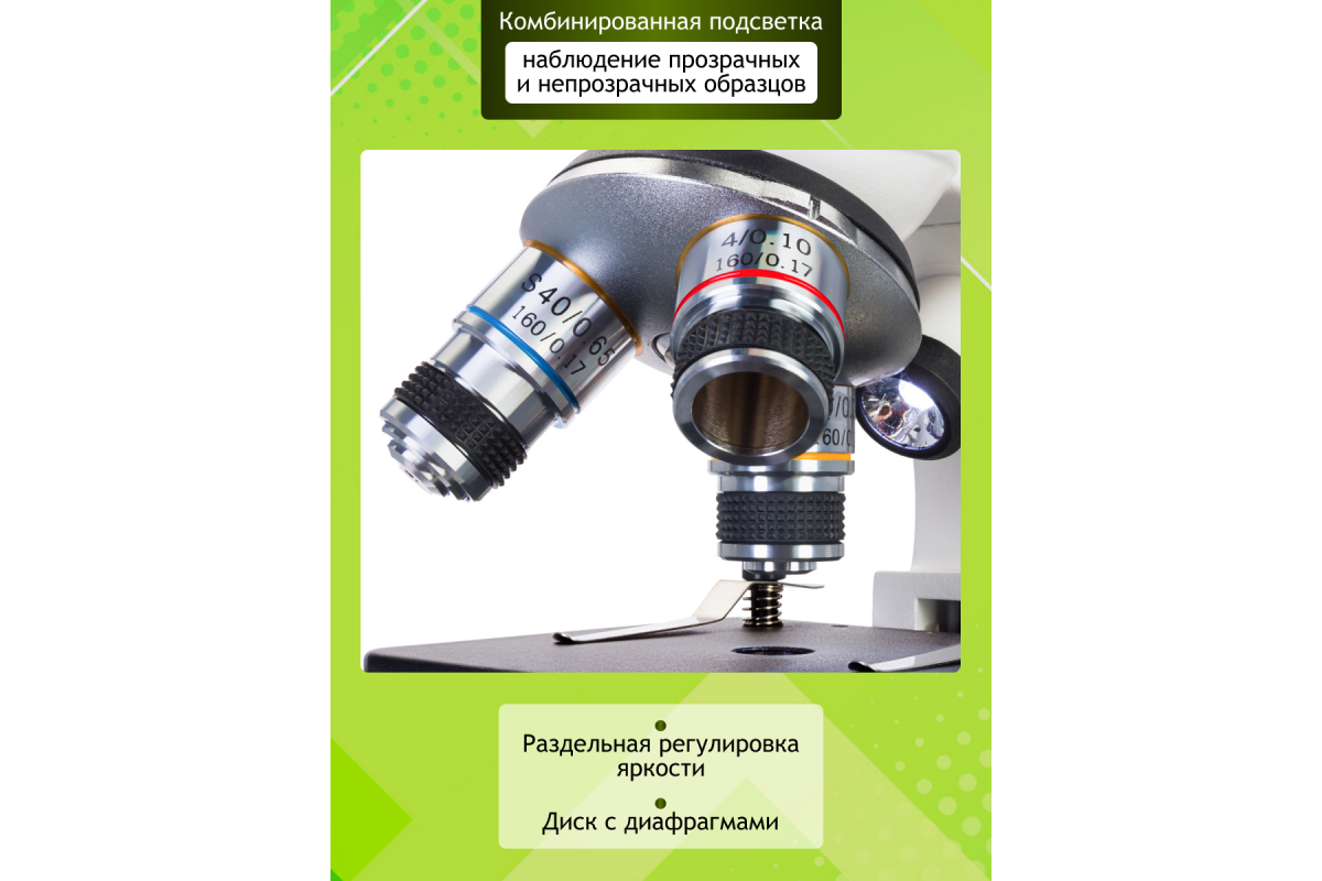 • Ахроматическая оптика, увеличение от 40 до 400 крат