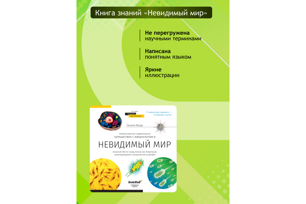 Чтобы исследования микромира стали еще результативнее и интереснее, обязательно прочтите книгу знаний «Невидимый мир». Это красочное познавательное пособие рассказывает просто о сложных вещах: устройстве микроскопа, обитателях микромира, способах проведения научных опытов. С помощью этой книги многие эксперименты можно будет провести самостоятельно – на страницах приведено их поэтапное описание.