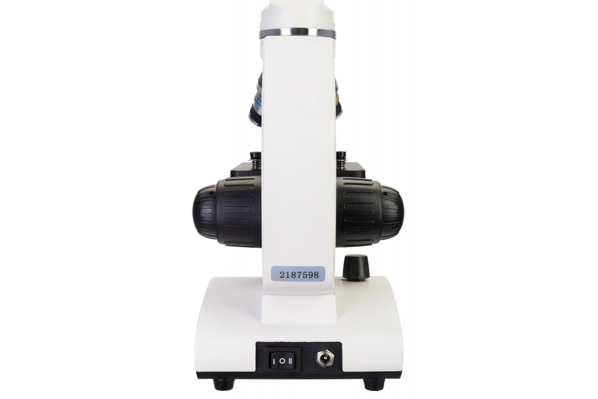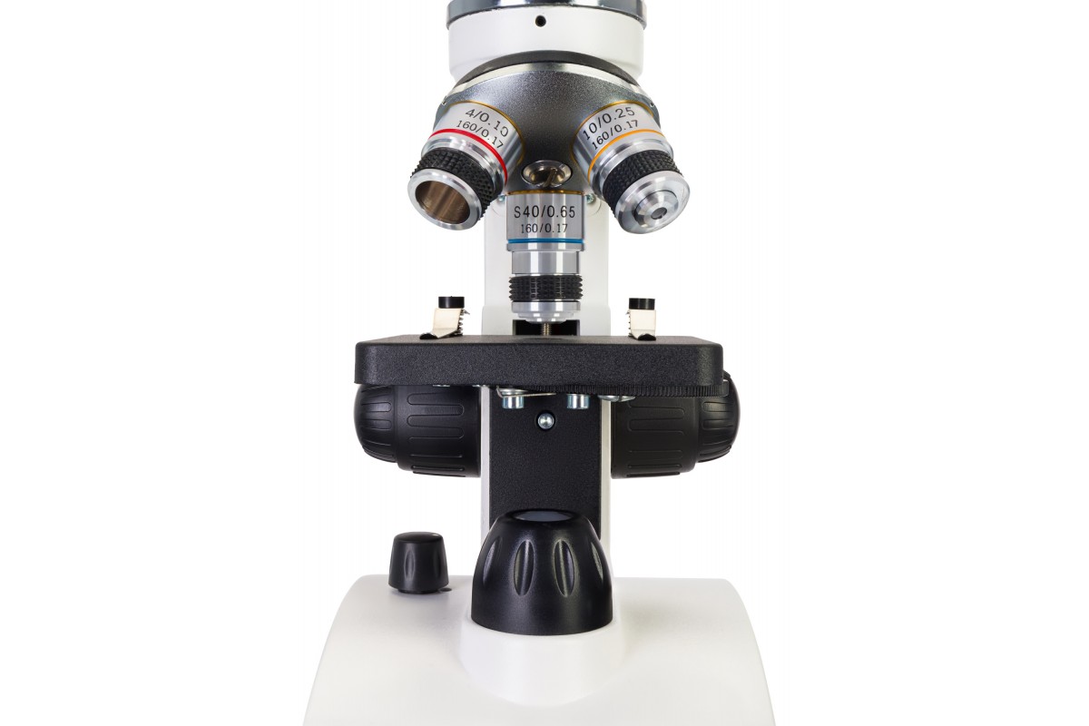Оптика микроскопа сделана из стекла, поэтому передаваемая картинка четкая и контрастная. Три ахроматических объектива дают увеличения 4х, 10х и 40х. 40-кратный объектив подпружинен. Широкопольный окуляр приближает в 10 раз. Общая кратность микроскопа составляет от 40 до 400 крат. Монокулярная насадка отклонена на угол в 45°, что делает более комфортными длительные наблюдения. Также насадку можно вращать на 360° – эта функция полезна при групповых исследованиях, так как позволяет показывать образец другому исследователю без перемещения микроскопа (нужно лишь повернуть насадку в нужную сторону). Отметим, что настраивать резкость можно не только грубо, но и точно.