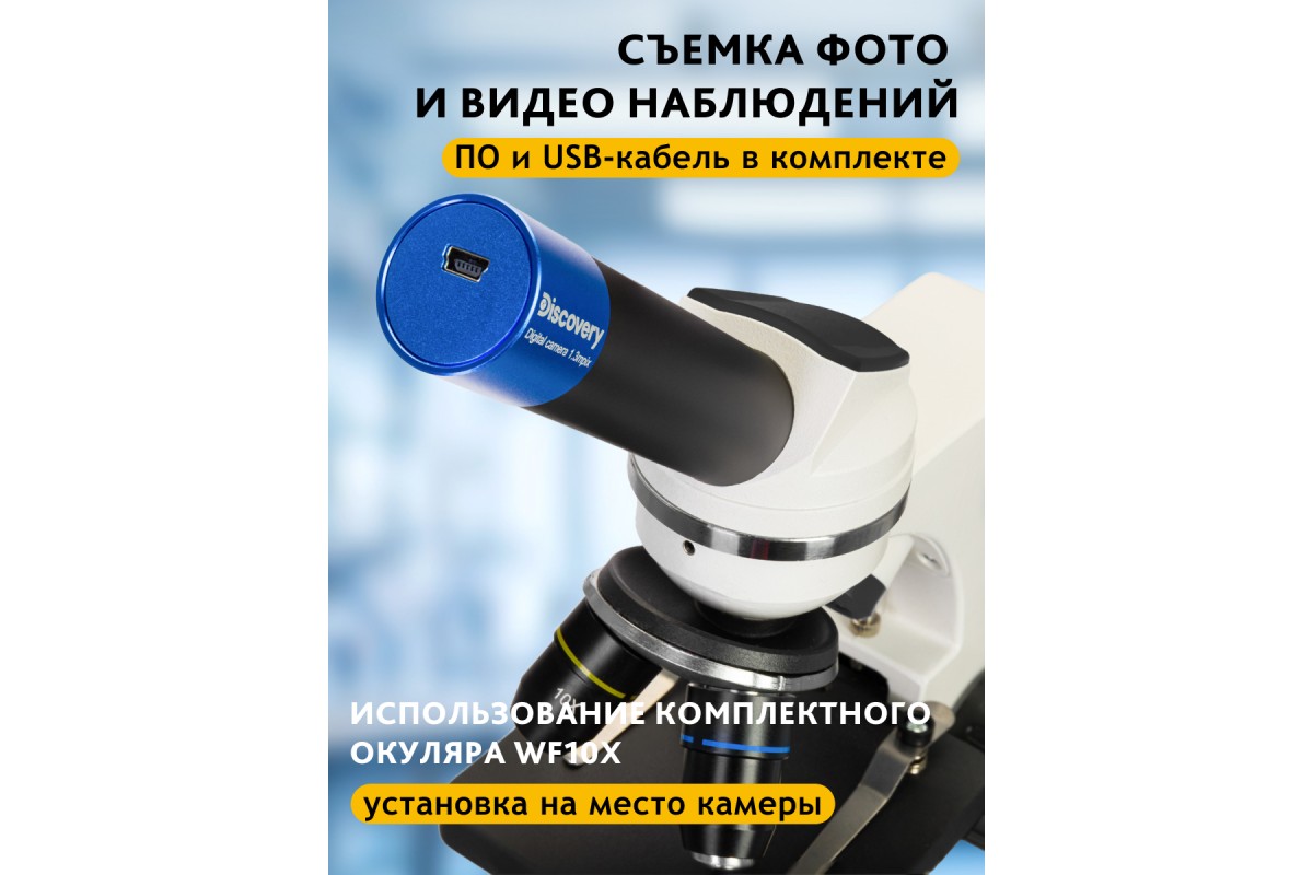 Штатный окуляр можно снять и установить на его место комплектную цифровую камеру 1,3 Мпикс. Если после этого камеру подключить к компьютеру и установить программное обеспечение с прилагаемого диска, на экран можно будет вывести картинку с объектива микроскопа. Также появится доступ к обработке изображений. Камера снимает фото, причем максимальное разрешение кадра составляет 1280x1024 пикс. Запись видео тоже возможна. Благодаря высокой кадровой частоте (30 кадров в секунду) ролики получаются очень плавными.