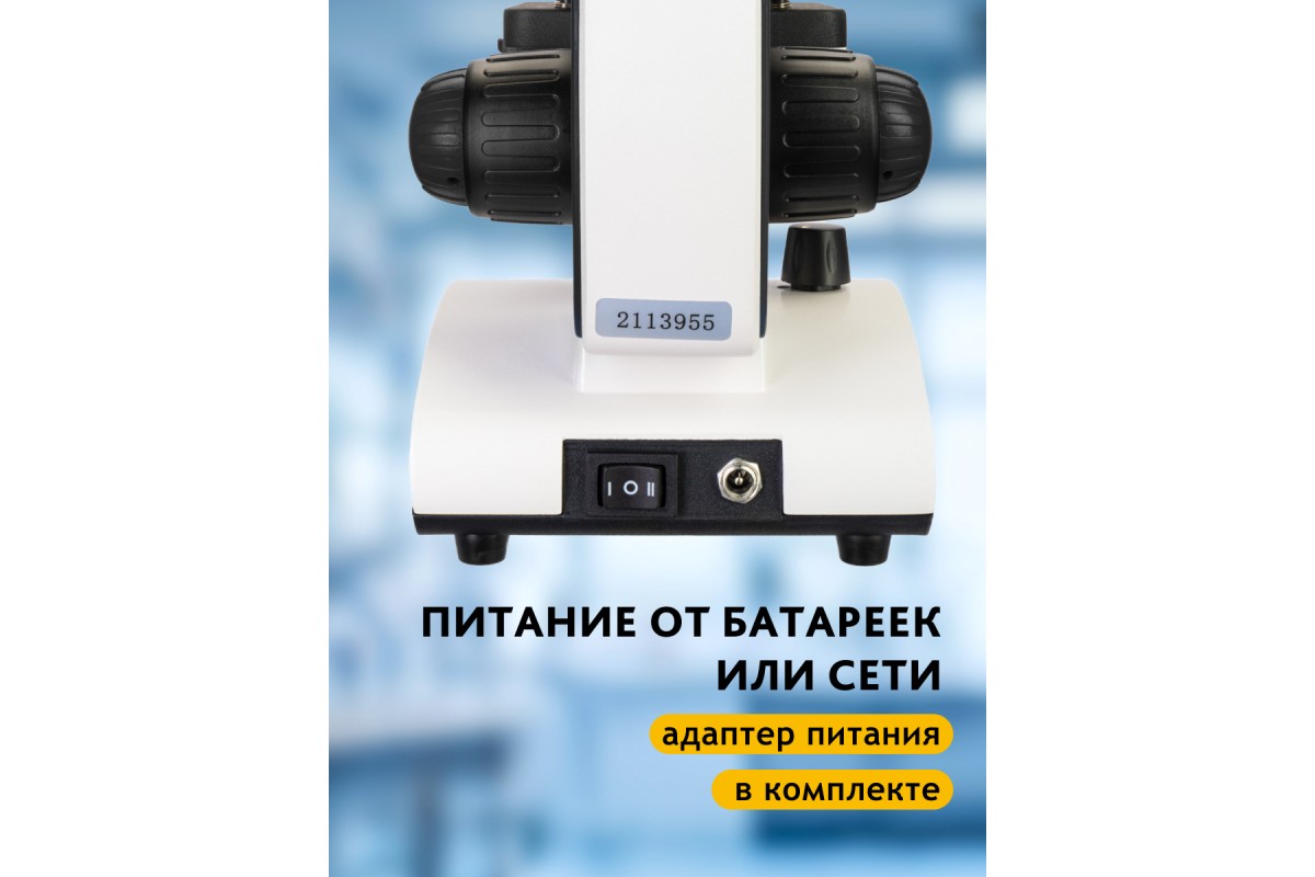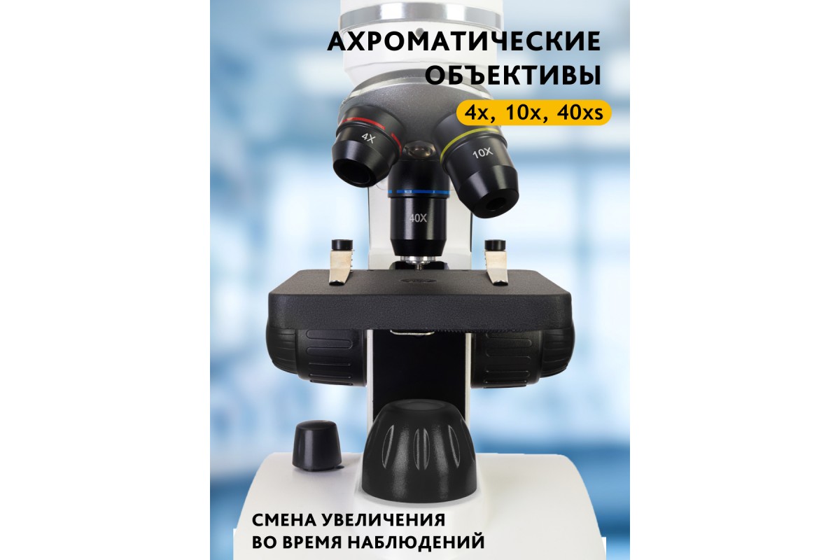 • Объективы-ахроматы, широкопольный окуляр, увеличение 40–400 крат