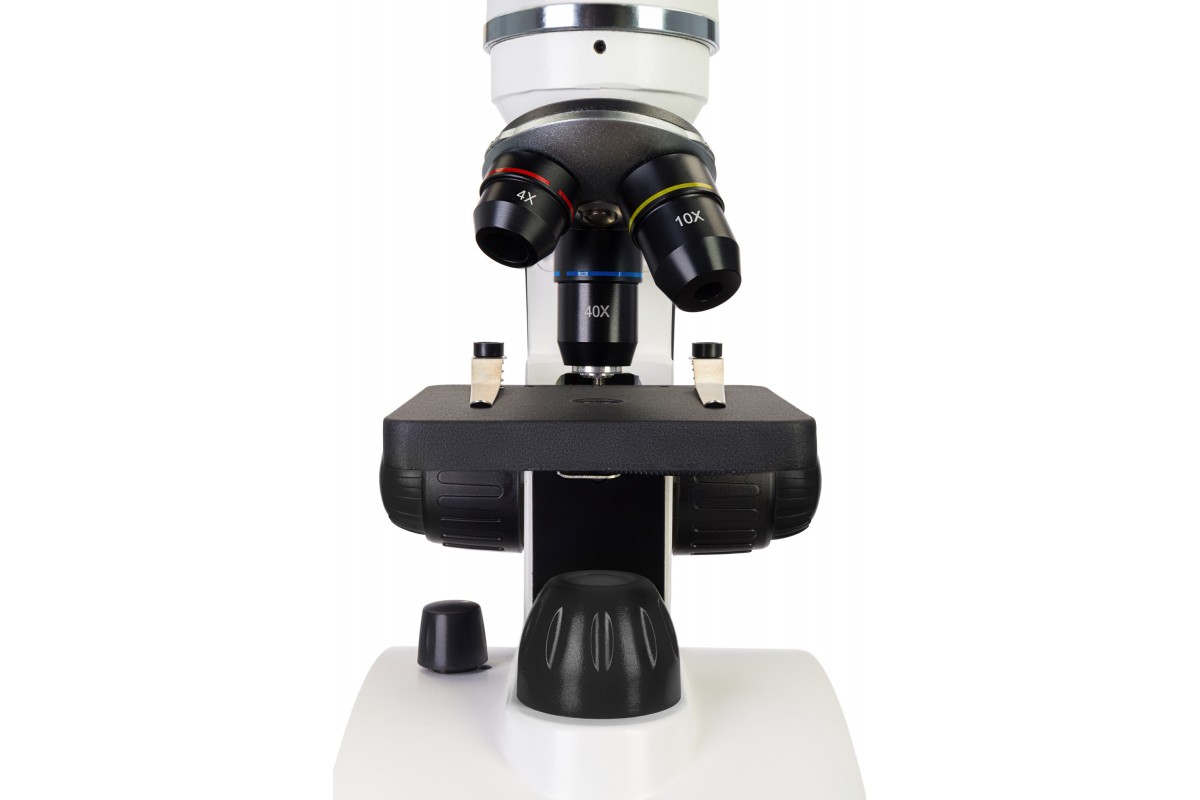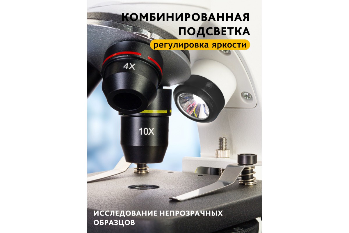 Микроскоп снабжен монокулярной насадкой, которая имеет комфортный для длительных наблюдений наклон в 30°. Ее можно поворачивать на 360°. Такая функция полезна при групповых исследованиях, когда для показа образца другому исследователю достаточно повернуть насадку, а не перемещать весь микроскоп целиком. Оптика стеклянная, ахроматическая. В комплекте 10-кратный широкопольный окуляр и три объектива с увеличениями 4х, 10х и 40х. У 40-кратного объектива есть пружинящая оправа. Фокусировку можно настраивать не только грубо, но и точно.