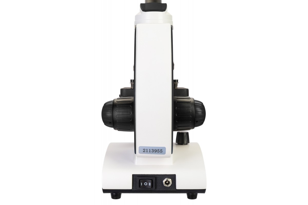 Предметный столик дополнен зажимами, которые надежно фиксируют микропрепарат в одном положении. Под столиком находится диск с диафрагмами. Подсветка – верхний и нижний светодиоды, яркость которых можно регулировать. Для питания подсветки используются или батарейки, или сеть переменного тока (адаптер питания включен в комплектацию).