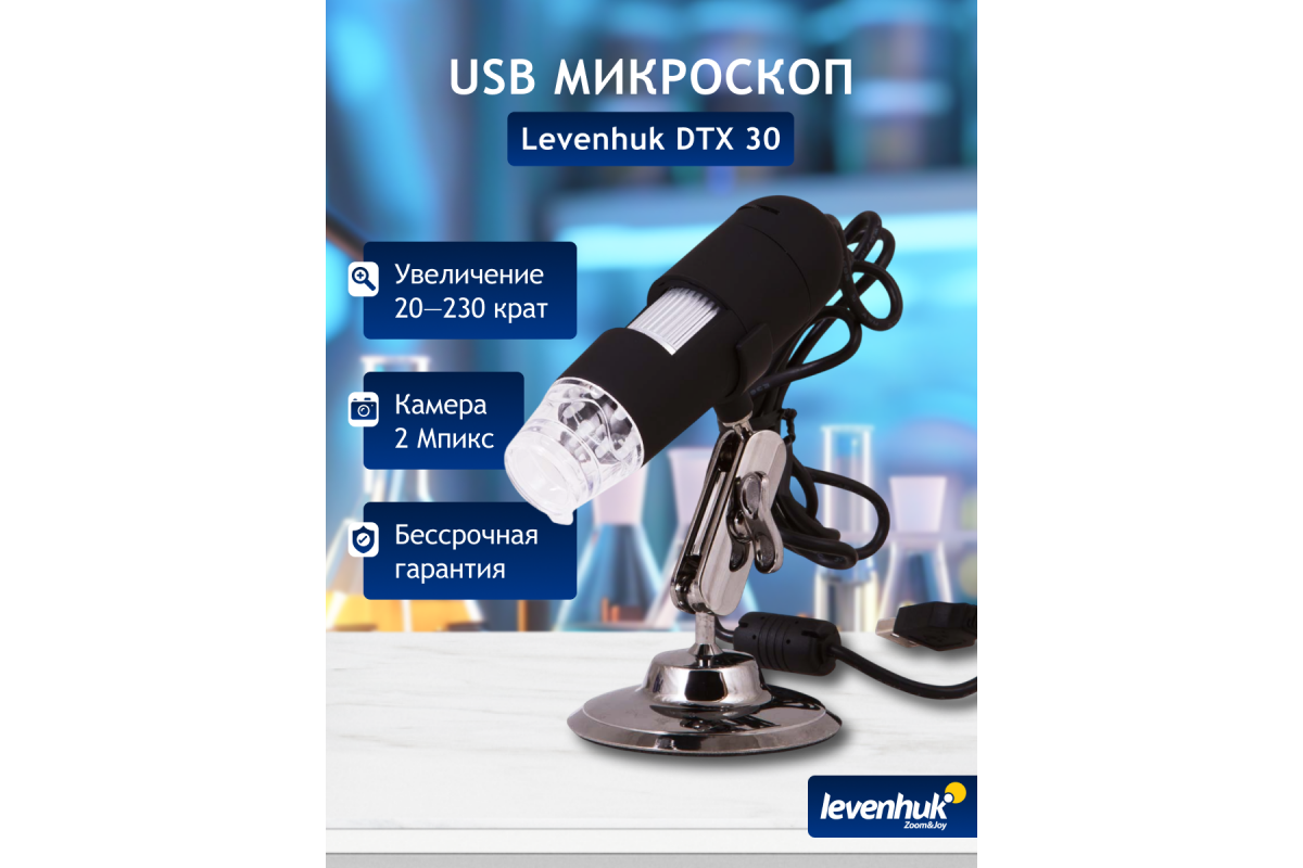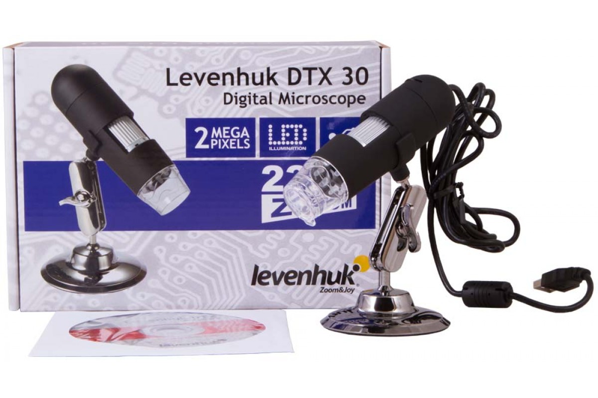 Levenhuk DTX 30 с увеличением от 20x до 200x – современный цифровой микроскоп с широким функционалом. Он оснащен 2-мегапиксельной камерой и подключается к компьютеру через стандартный USB-порт. Фото- и видеоматериалы с объектами исследования можно просмотреть, редактировать и сохранить с помощью программы захвата изображений. Измерить длину, углы и получить другие линейные размеры изучаемого образца позволяет встроенное программное обеспечение. Микроскоп имеет светодиодную подсветку с возможностью регулировки яркости. Прибор совместим с операционными системами Windows и Mac. Цифровой микроскоп будет интересен не только специалистам, но и любителям микромира. Прибор прост в эксплуатации и не требует специальной подготовки пользователя.
