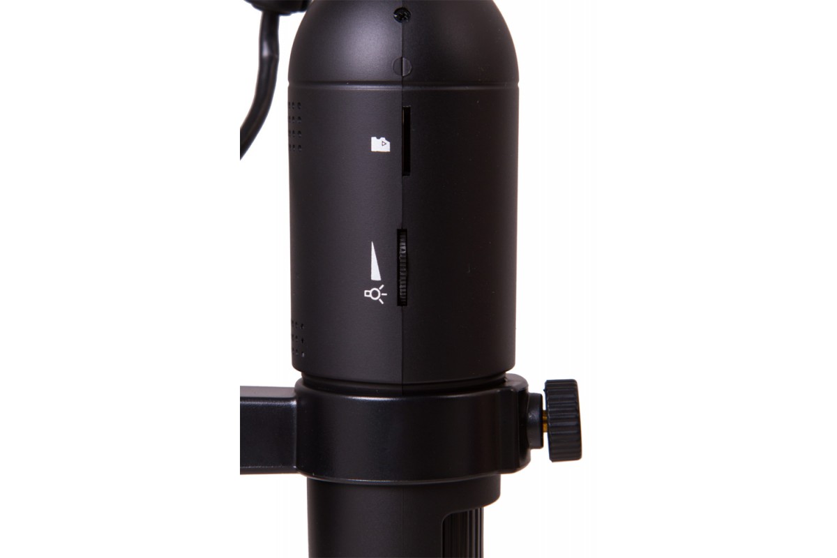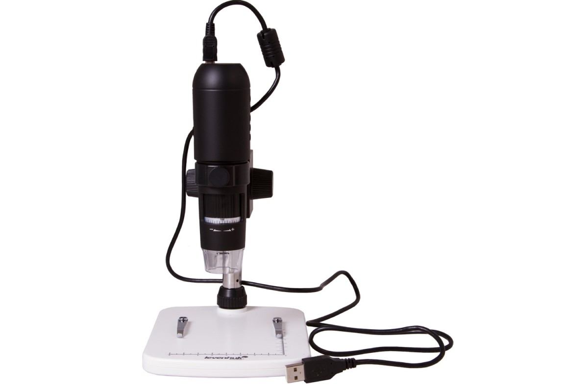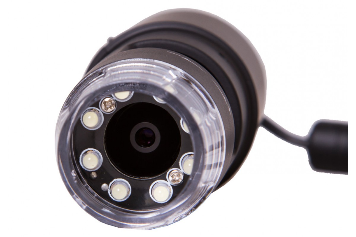 Микроскоп имеет плавно изменяемое увеличение в диапазоне от 10 до 200 крат. Фокусировка грубая, но колесо настройки двигается точно и без рывков. Для изучения образцов при плохой освещенности используйте встроенную подсветку. Она состоит из восьми ярких светодиодов и включается нажатием одной кнопки. Для питания подсветки используется сетевой адаптер или USB-кабель, подключенный к компьютеру.