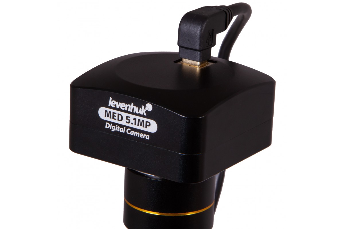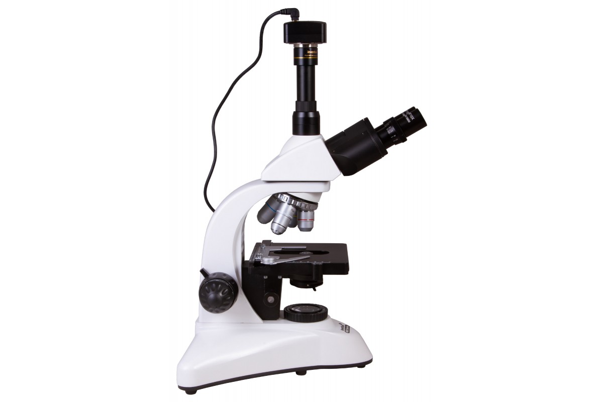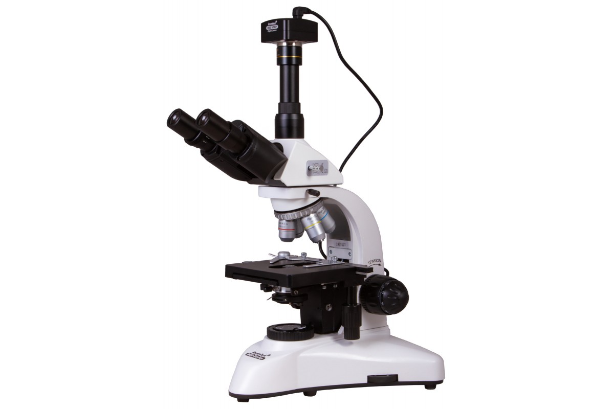 Насадку можно поворачивать на 360°. Визуальная часть наклонена под 30-градусным углом, а окулярная трубка для установки цифровой камеры расположена вертикально. Есть делитель светового потока. Камера снабжена чувствительным сенсором 5,1 Мпикс, может делать одиночные фотографии и снимать видеоролики. Разрешения снимков хватает для профессиональных исследований и создания подробных цифровых архивов. Тринокулярный микроскоп с цифровой камерой – это отличная возможность облегчить длительную работу в лаборатории. Картинка с объектива микроскопа выводится на внешний экран, что избавляет от необходимости постоянно смотреть в объективы, напрягая зрение и мышцы плечевого пояса.