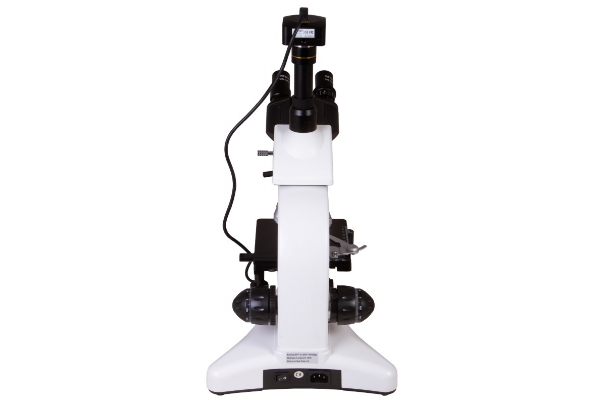 Тринокулярная насадка разделена на бинокулярную визуальную часть и отдельную вертикальную трубку для установки цифровой камеры. Наблюдения ведутся сразу обоими глазами, а благодаря широкопольным окулярам работать можно и с протяженными образцами. Планахроматические объективы создают плоское поле, минимизируют оптические искажения и улучшают цветопередачу. Наблюдения можно вести на увеличении от 40 до 1000 крат. Резкость настраивается ручками грубой и точной фокусировки.