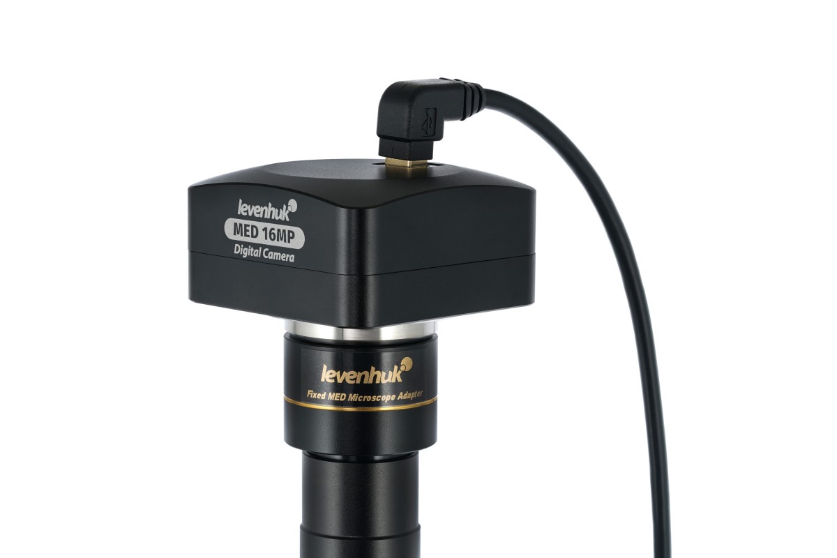 18-мегапиксельная камера устанавливается в вертикальную окулярную трубку и подключается к компьютеру при помощи USB-кабеля. Она передает картинку с объектива микроскопа в режиме реального времени, позволяет записывать видеоролики и снимать фотографии. Высокое качество записей и снимков позволяет использовать их в профессиональной деятельности. Кроме того, в комплекте есть диск с программой для обработки изображений.