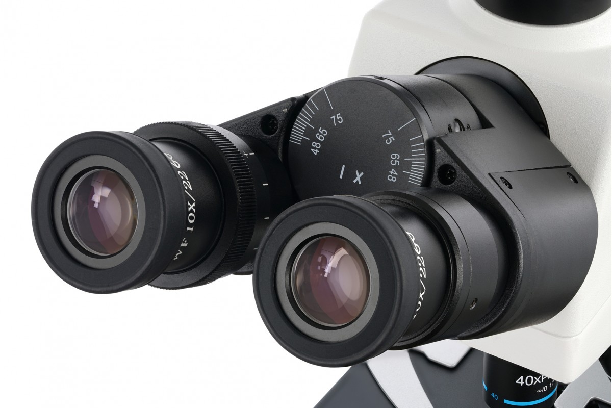 В микроскопе используется планахроматическая оптика, которая убирает хроматизм и снижает другие искажения. Передаваемая картинка получается четкой, контрастной и ясной. 10-кратные окуляры дают хороший обзор и позволяют корректировать диоптрии. Тринокулярная насадка разделена на визуальную часть и трубку для установки вертикальной камеры. Она вращается на 360°, что удобно при групповых исследованиях. А небольшой 30-градусный наклон визуального блока облегчает длительную работу с микроскопом – мышцы шеи и плечевого пояса меньше напрягаются. В револьверное устройство можно установить до пяти объективов, в комплект поставки включены четыре – это фазовые планахроматические модели. 40-кратный и 100-кратный объективы снабжены пружинящими оправами, и 100-кратный объектив можно использовать для масляной иммерсии. Оптика сделана из стекла с антигрибковым покрытием, есть грубая и точная регулировки резкости.