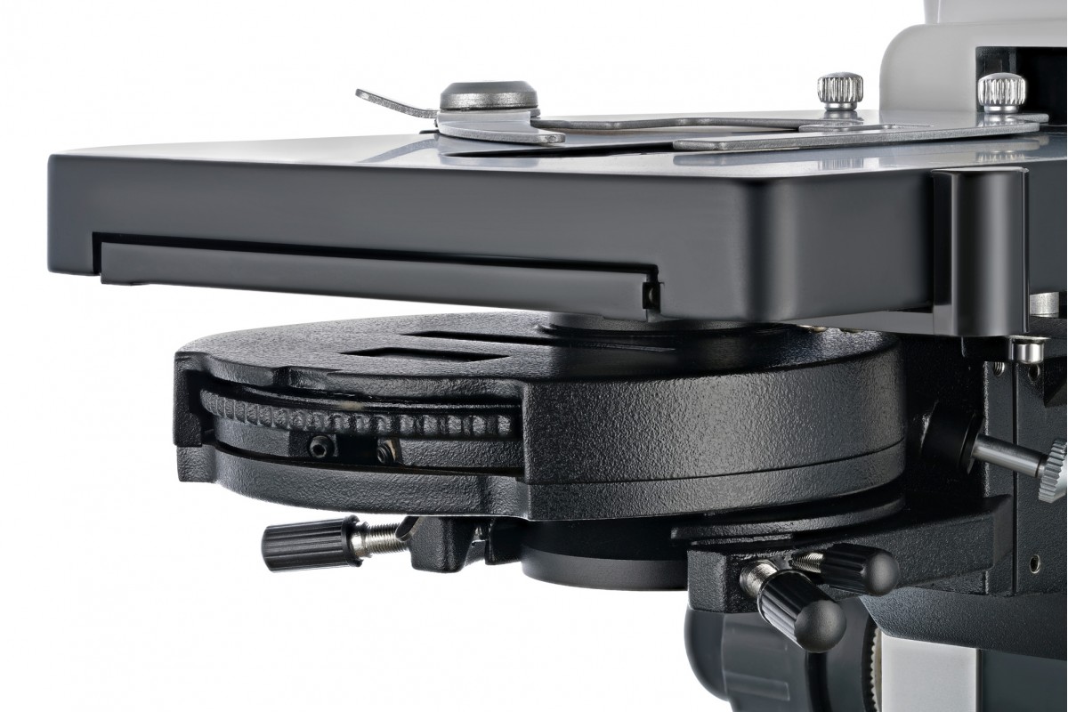 Предметный столик можно перемещать по двум направлениям. Препаратоводитель помогает точно установить образцы под объективом микроскопа. Яркий 5-ваттный светодиод освещает микропрепараты снизу, при этом свет проходит через фазовый конденсор («сухой»). Есть держатель фильтра. Яркость подсветки регулируется.
