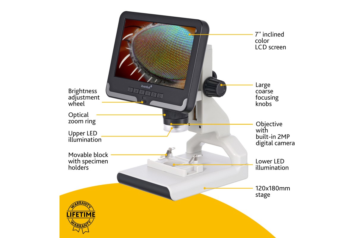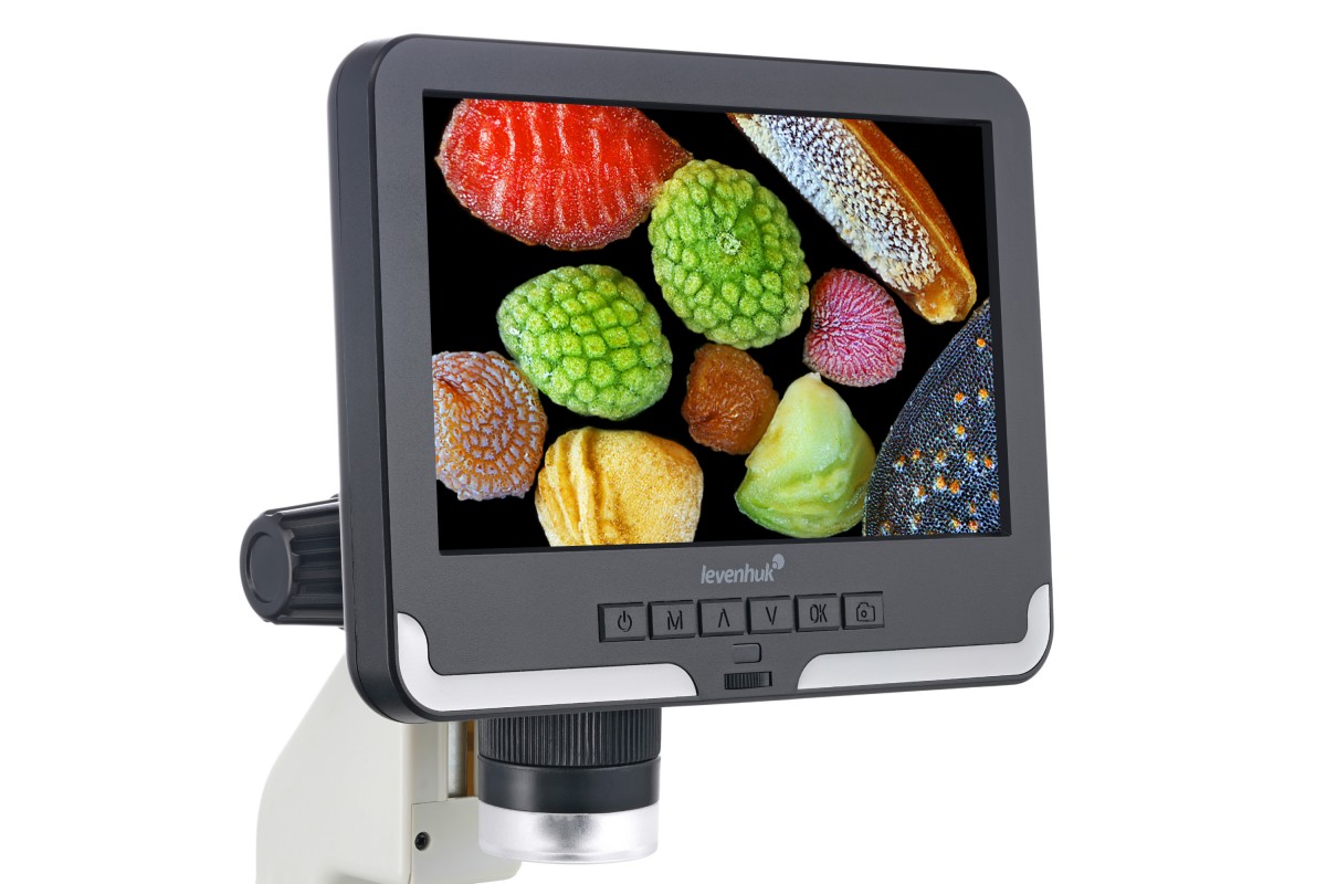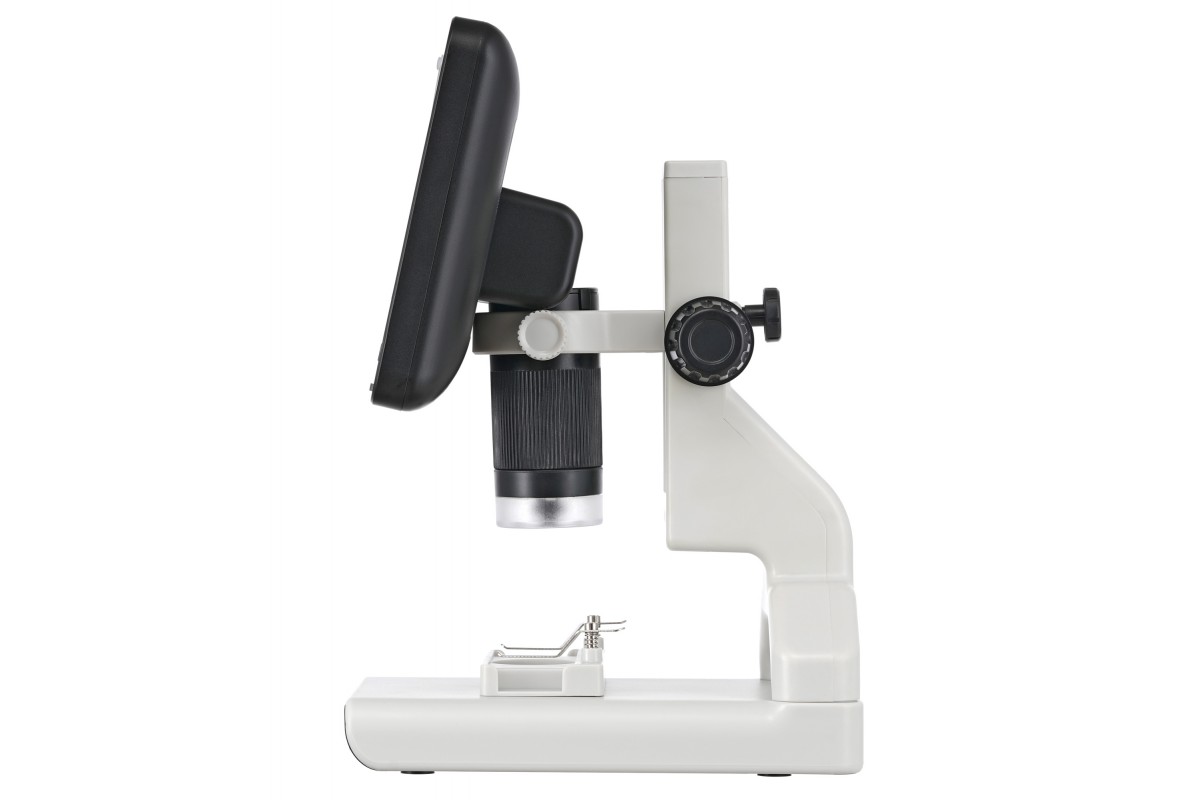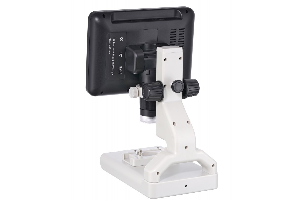 Вместо классических окуляров в этом микроскопе установлен большой 7-дюймовый ЖК-экран (диагональ около 18 см). Картинка выводится в цвете, она контрастная и высокодетализированная. Доступно цифровое и оптическое увеличение. Общий диапазон кратности составляет от 10 до 200 крат, оптический – от 10 до 50 крат. Также микроскоп дает возможность делать фото в качестве 12 Мпикс и записывать видео в разрешении Full HD. Запись ведется на карту памяти, которая приобретается отдельно.