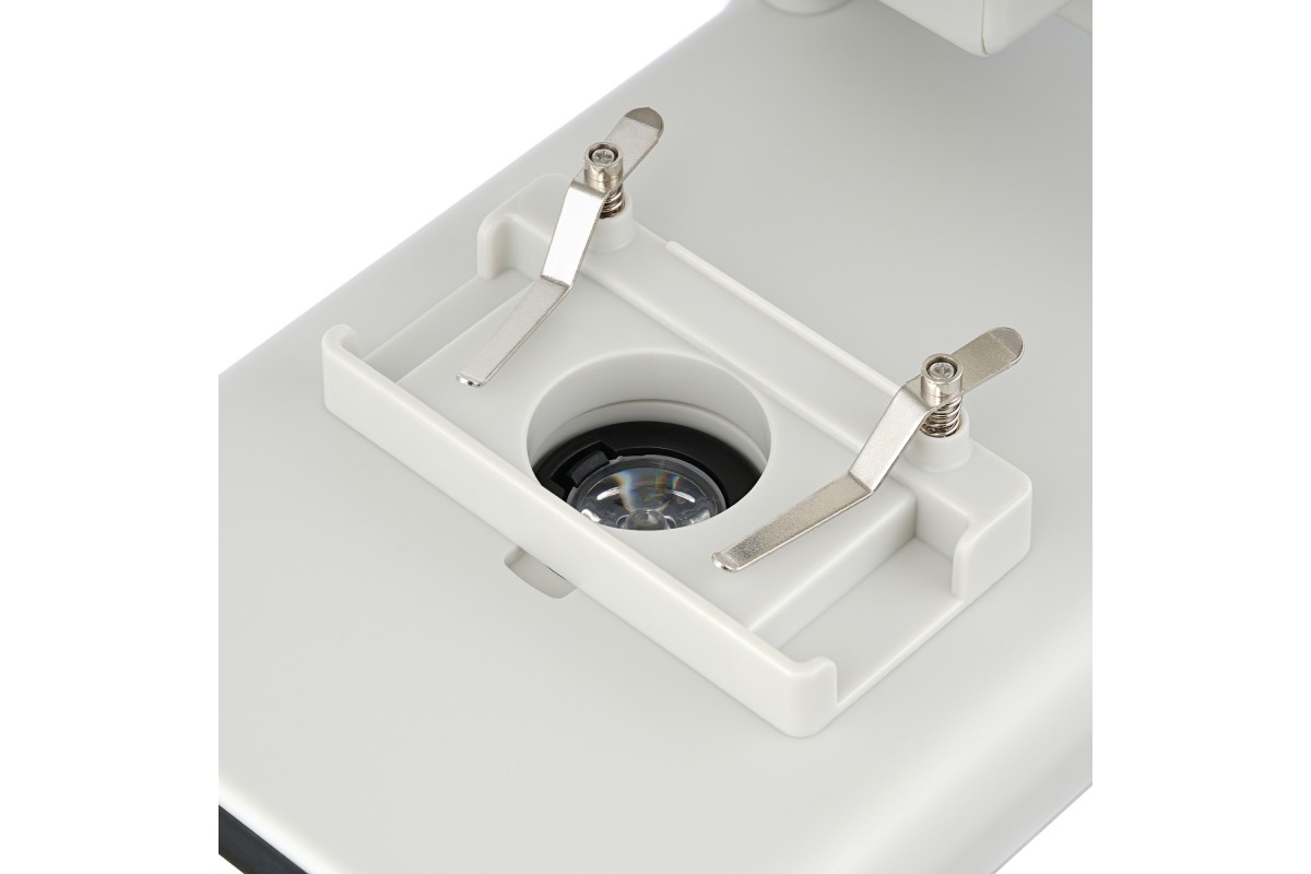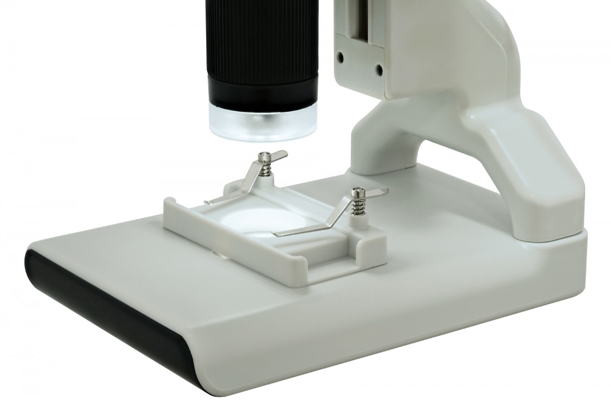 Предметный столик снабжен зажимами. Подсветка расположена сверху и снизу, поэтому рассматривать можно образцы любой степени прозрачности. Есть регулировка яркости. Управлять микроскопом можно при помощи кнопок на корпусе или используя пульт дистанционного управления. Пульт многофункциональный, среди прочего он позволяет регулировать яркость подсветки, выбирать увеличение, запускать запись видео, фотографировать.