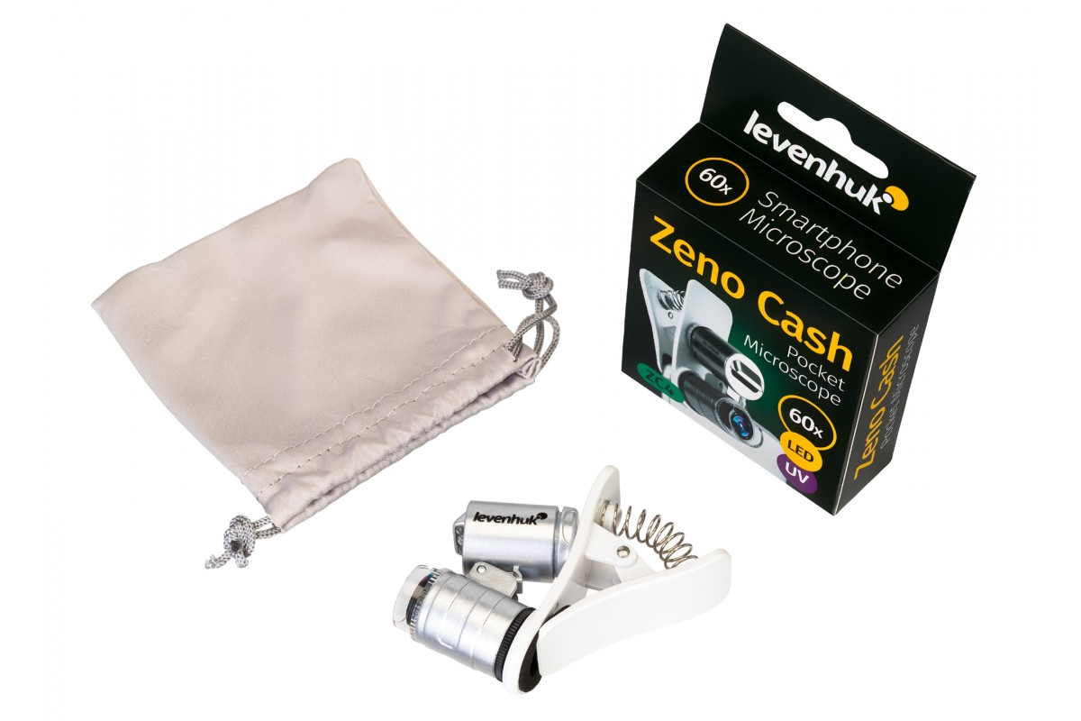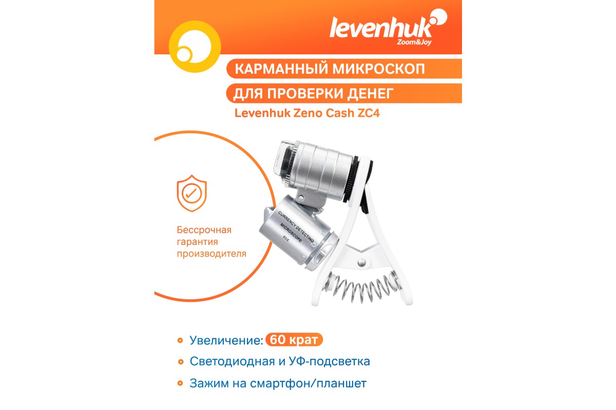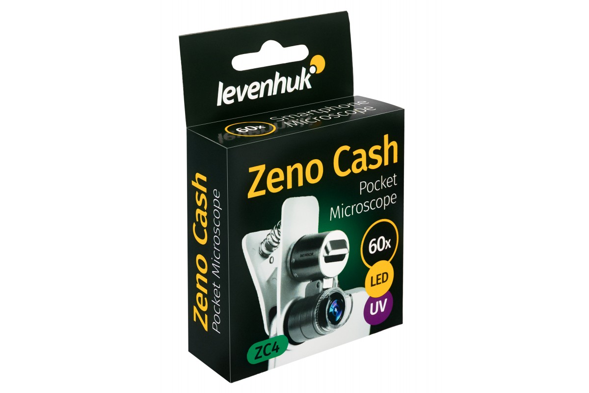 Levenhuk Zeno Cash ZC4 – карманная модель микроскопа, разработанная специально для проверки банкнот. Для этой цели прибор снабжен ультрафиолетовой подсветкой. Микроскоп пригодится бизнесмену, кассиру и любому человеку, совершающему покупки за наличные. Дополнительная подсветка из пары обычных светодиодов позволяет применять микроскоп для изучения разных объектов на увеличении в 60 крат – например, марок и других предметов коллекционирования.