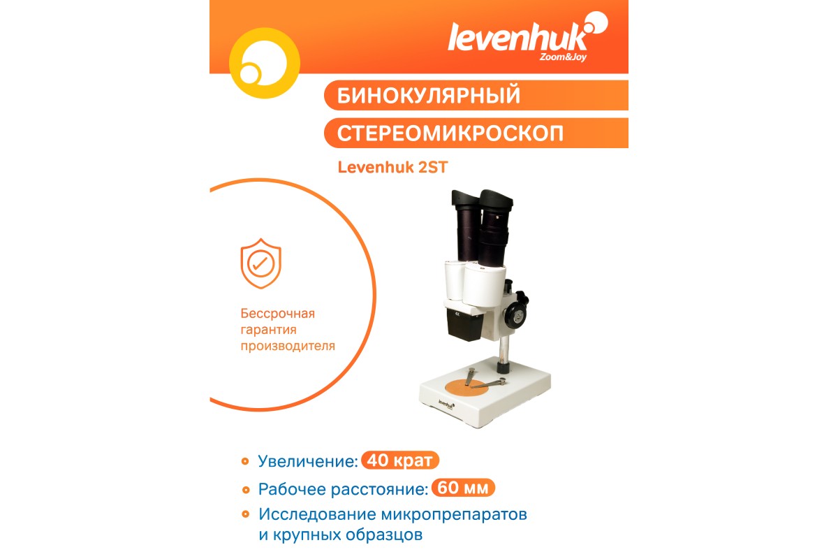 Микроскоп Levenhuk 2ST – современный инструментальный стереомикроскоп с увеличением 40 крат и рабочим расстоянием 60 мм. С помощью данной модели можно исследовать довольно крупные объекты: кусочки пород, монеты, ювелирные изделия, получая при этом четкое и объемное изображение. Такой портативный инструментальный микроскоп может стать незаменимым инструментом для проведения исследований в походных условиях. Археологи, геологи, биологи и коллекционеры по достоинству оценят и тот факт, что при проведении исследований используется естественное освещение. Предметный столик микроскопа двусторонний (с одной стороны черный, а с другой – белый). На корпусе микроскопа есть колесико грубой настройки фокусировки. В комплекте: