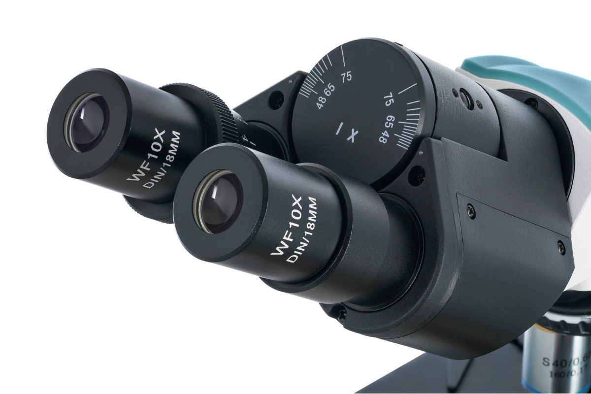 Поворотную насадку можно вращать на 360°, бинокулярный визуальный узел имеет удобный для длительной работы наклон в 30°. Окуляры широкопольные и дают увеличение в 10 крат, револьверное устройство вмещает четыре объектива – в него уже установлены ахроматические объективы с увеличением 4х, 10х, 40х и 100х. 100-кратный объектив можно использовать для масляной иммерсии. Обратите внимание, что объективы 40х и 100х имеют специальные пружинящие оправы, защищающие переднюю линзу от случайных повреждений.