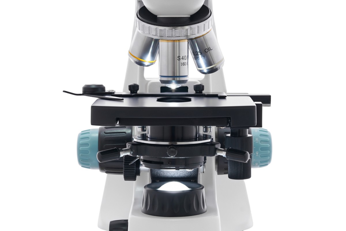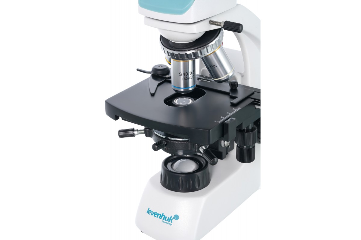 Образцы для исследований устанавливаются под объективом при помощи препаратоводителя. Резкость оптики настраивается ручками грубой и точной фокусировки. Система освещения расположена под предметным столиком и имеет регулировку яркости. Подсветка представляет собой светодиод с коллектором, а конденсор Аббе снабжен ирисовой диафрагмой и держателем фильтра.