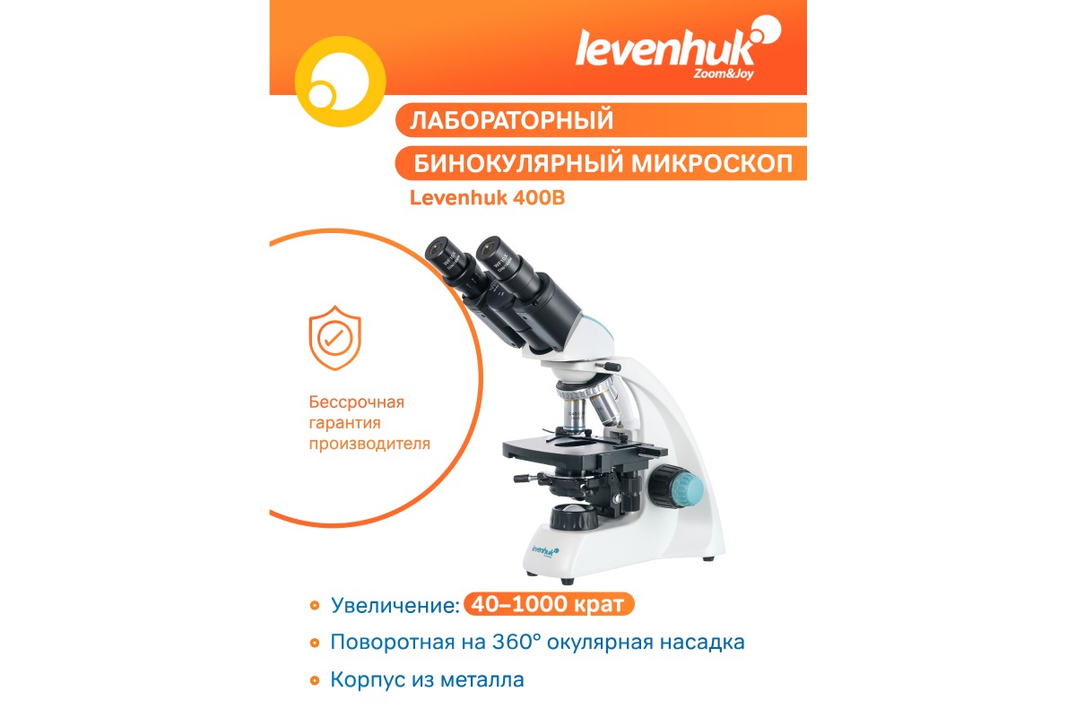 Levenhuk 400B – бинокулярный лабораторный микроскоп для работы с биологическими образцами. Этот оптический прибор создан специально для микробиологов, биохимиков, ветеринаров и медиков. Микроскоп позволяет проводить профессиональные исследования на увеличении от 40 до 1000 крат. Можно использовать метод светлого поля и масляную иммерсию.