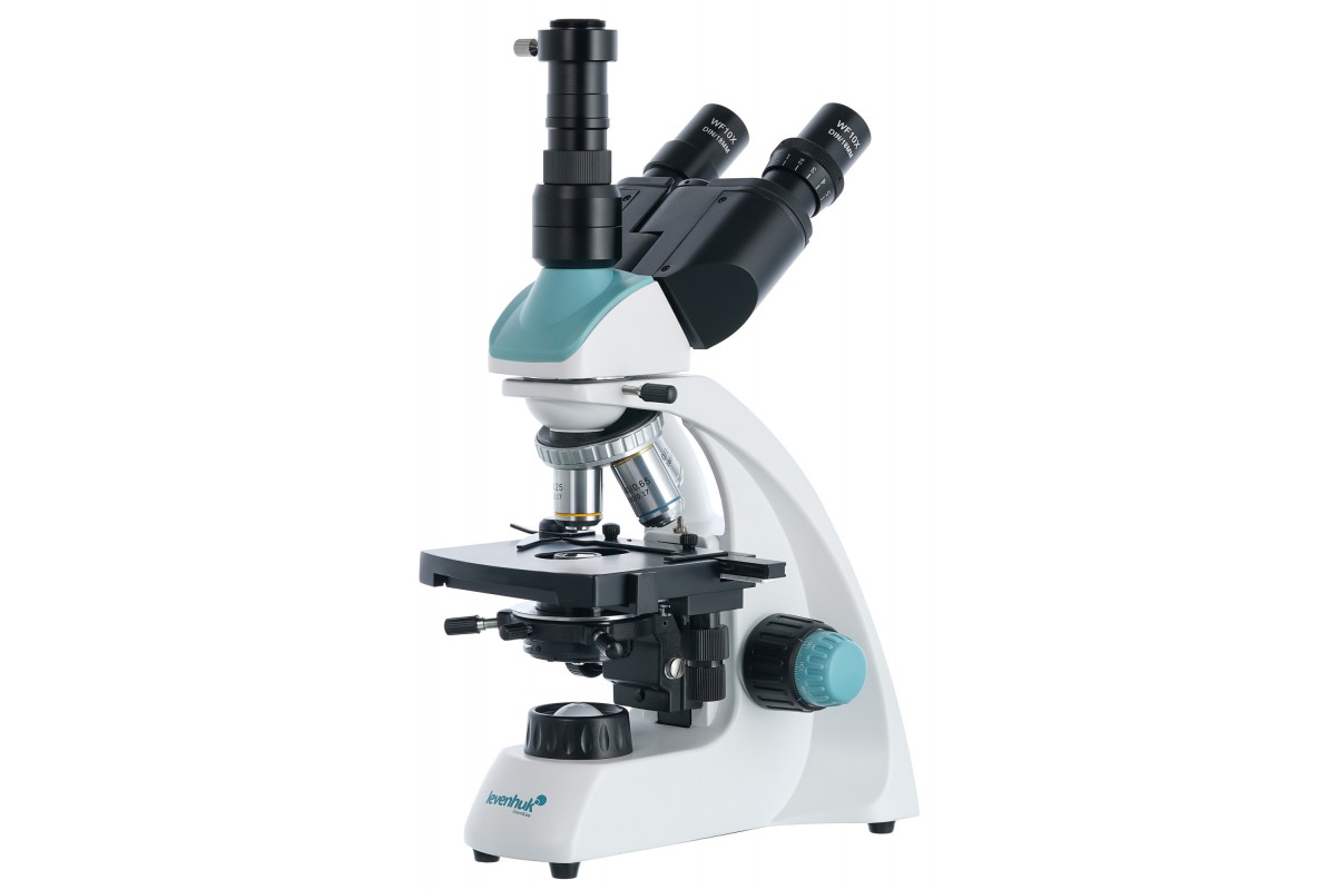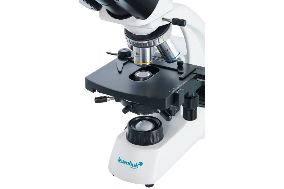 В микроскопе установлена тринокулярная насадка. Она поворотная – вращается на 360°, визуальный узел имеет небольшой наклон в 30°, а в вертикальную окулярную трубку можно установить цифровую камеру (нет в комплекте). Оптика ахроматическая и широкопольная. Окуляры дают 10-кратное увеличение, объективы приближают в 4, 10, 40 и 100 раз. У объективов 40х и 100х есть пружинящие оправы, защищающие переднюю линзу от случайного повреждения. Для масляной иммерсии используется объектив 100х. Резкость оптики настраивается ручками грубой и точной фокусировки.