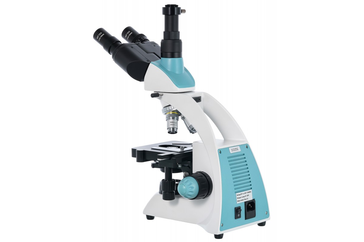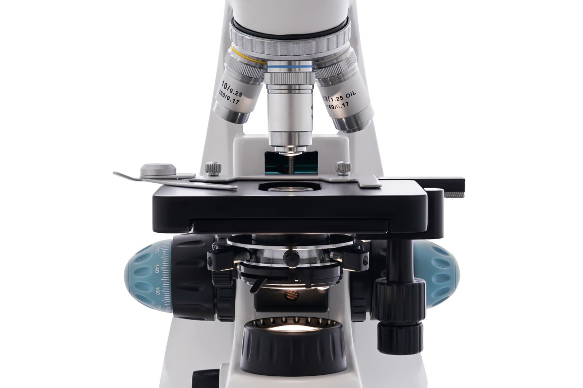 Насадка состоит из бинокулярного визуального блока (он имеет небольшой наклон в 30°) и отдельно расположенной вертикальной трубки (в нее можно установить цифровую камеру). Насадка вращается, что делает работу в лаборатории более удобной. Окуляры широкопольные и дают увеличение в 10 крат. Ахроматические объективы уже установлены в револьверное устройство. 40-кратный и 100-кратный объективы имеют защиту передней линзы – специальную пружинящую оправу. 100-кратный объектив используется для масляной иммерсии. Оптическая схема микроскопа позволяет проводить исследования на увеличении от 40 до 1000 крат. Для настройки резкости применяется коаксиальный механизм грубой и точной фокусировки.