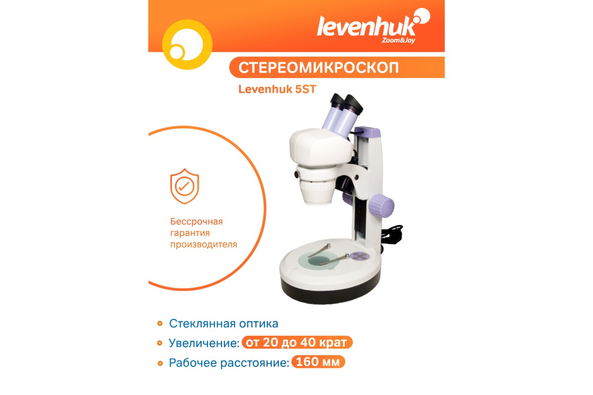Микроскоп Levenhuk 5ST – современный инструментальный микроскоп с большим рабочим расстоянием 160 мм и переменным увеличением в диапазоне от 20 до 40 крат. Большое рабочее расстояние позволит изучить самые крупные образцы биологических материалов, а также геологические образцы, ювелирные изделия, часы, текстиль, продукты животноводства и прочее. Есть возможность выбрать поле предметного столика: темное или светлое. Модель эргономична, благодаря бинокулярной насадке с углом наклона в 60° относительно вертикали, возможности регулировки межзрачкового расстояния, наличию грубой фокусировки и верхней и нижней подсветки. Микроскоп передает высокоточное объемное изображение изучаемого образца, что позволяет детально изучить все его особенности и провести точные замеры без погрешностей.