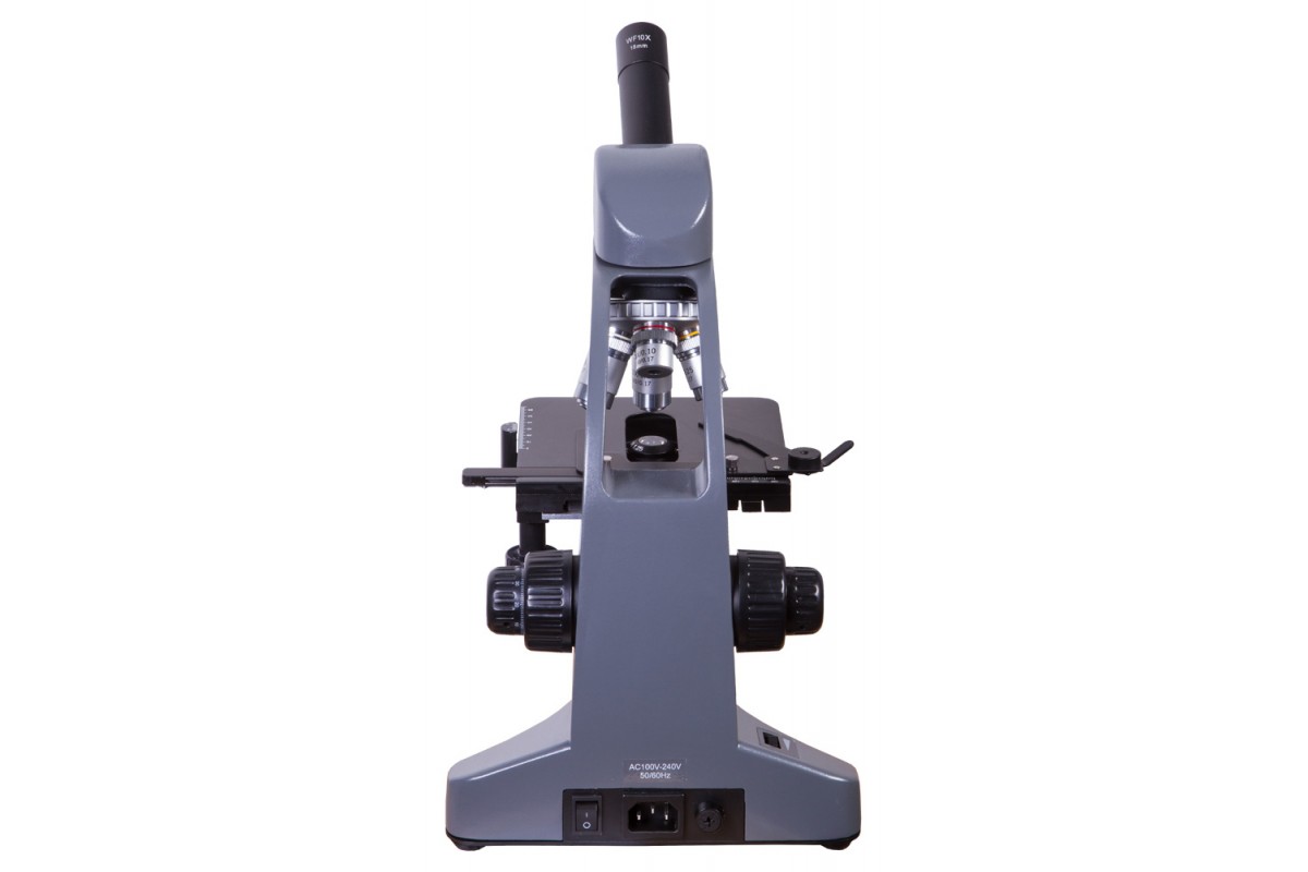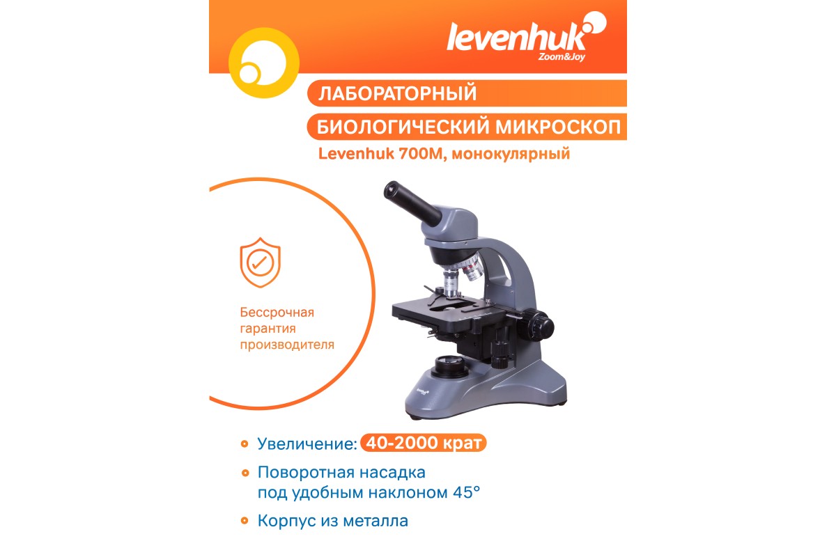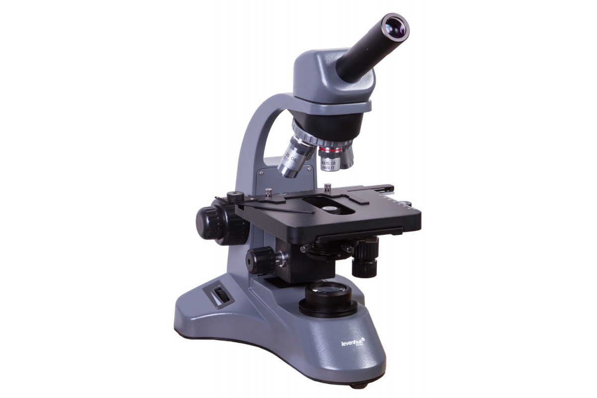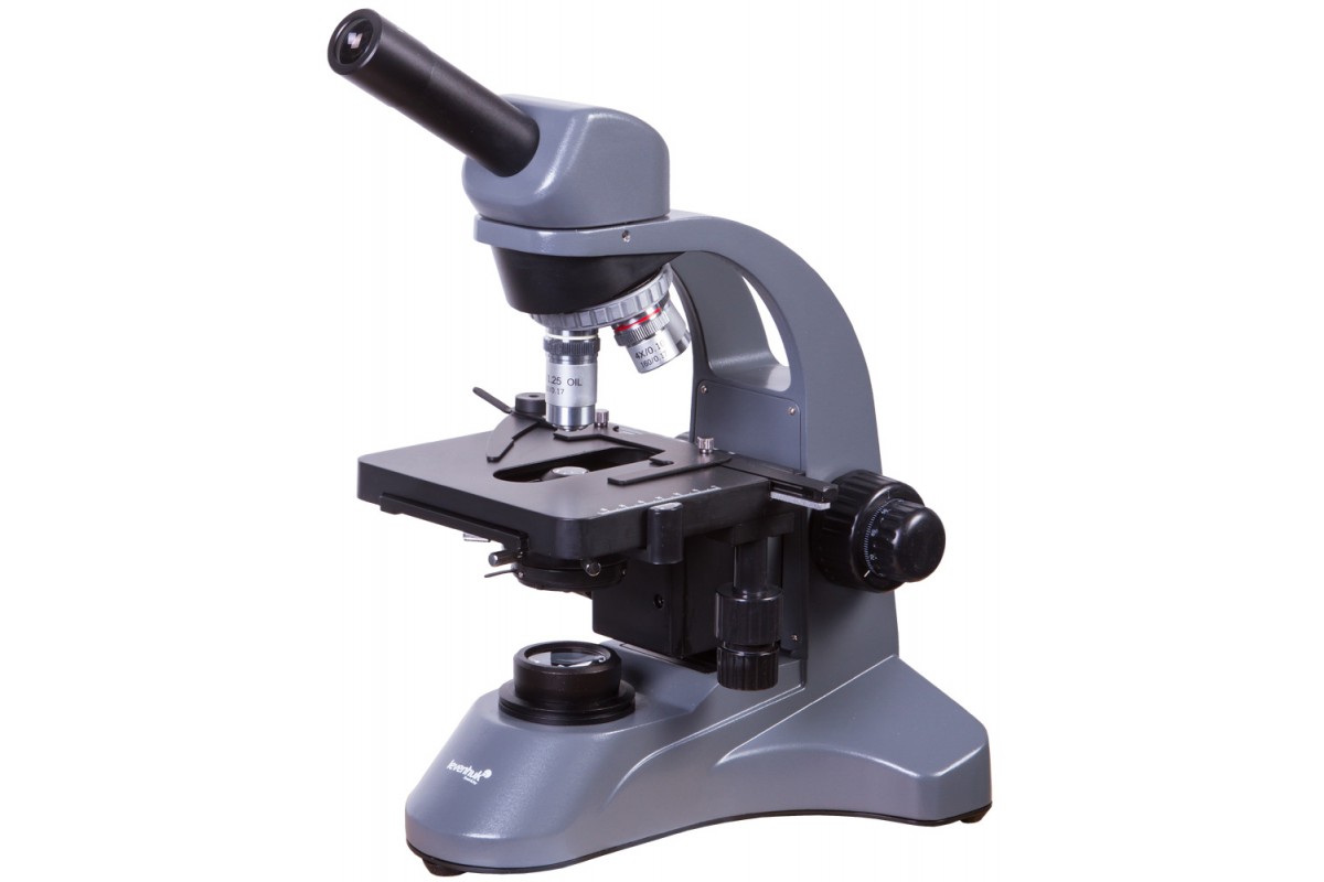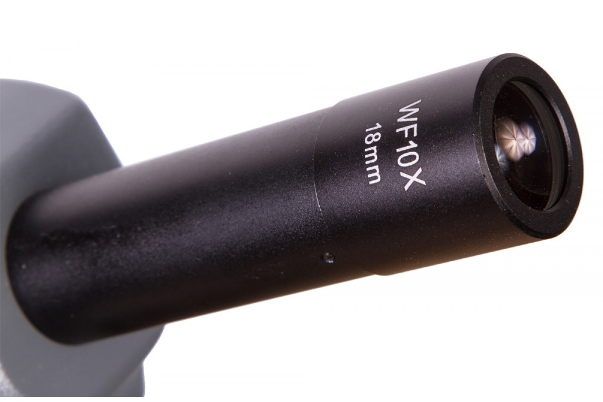 Биологический микроскоп Levenhuk 700M имеет поворотную монокулярную насадку. Ее можно разворачивать на 360°, позволяя окружающим следить за ходом исследований. Наклон насадки составляет 45° – это комфортный угол для проведения длительных наблюдений.