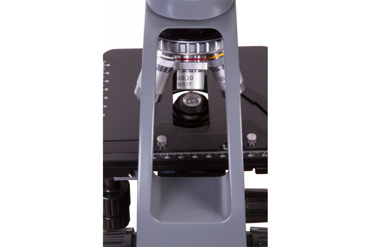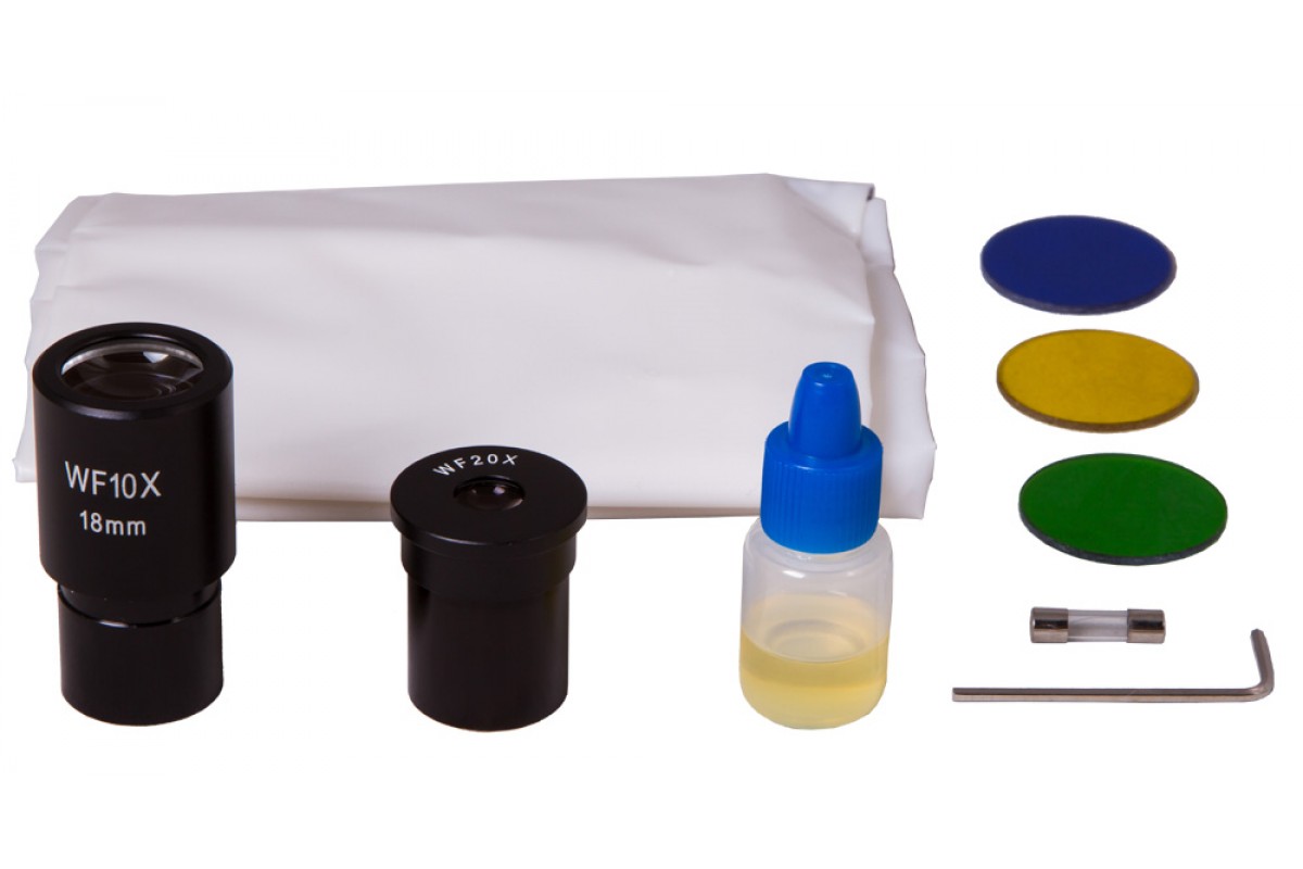 Револьверное устройство рассчитано на 4 объектива. В комплекте идут ахроматические объективы. Объектив максимальной кратности можно использовать для иммерсионного метода наблюдений. В этом случае улучшается яркость картинки и увеличивается глубина резкости. К микроскопу прилагается пара сменных широкоугольных окуляров: 20-кратный окуляр и окуляр с увеличением в 10 крат.