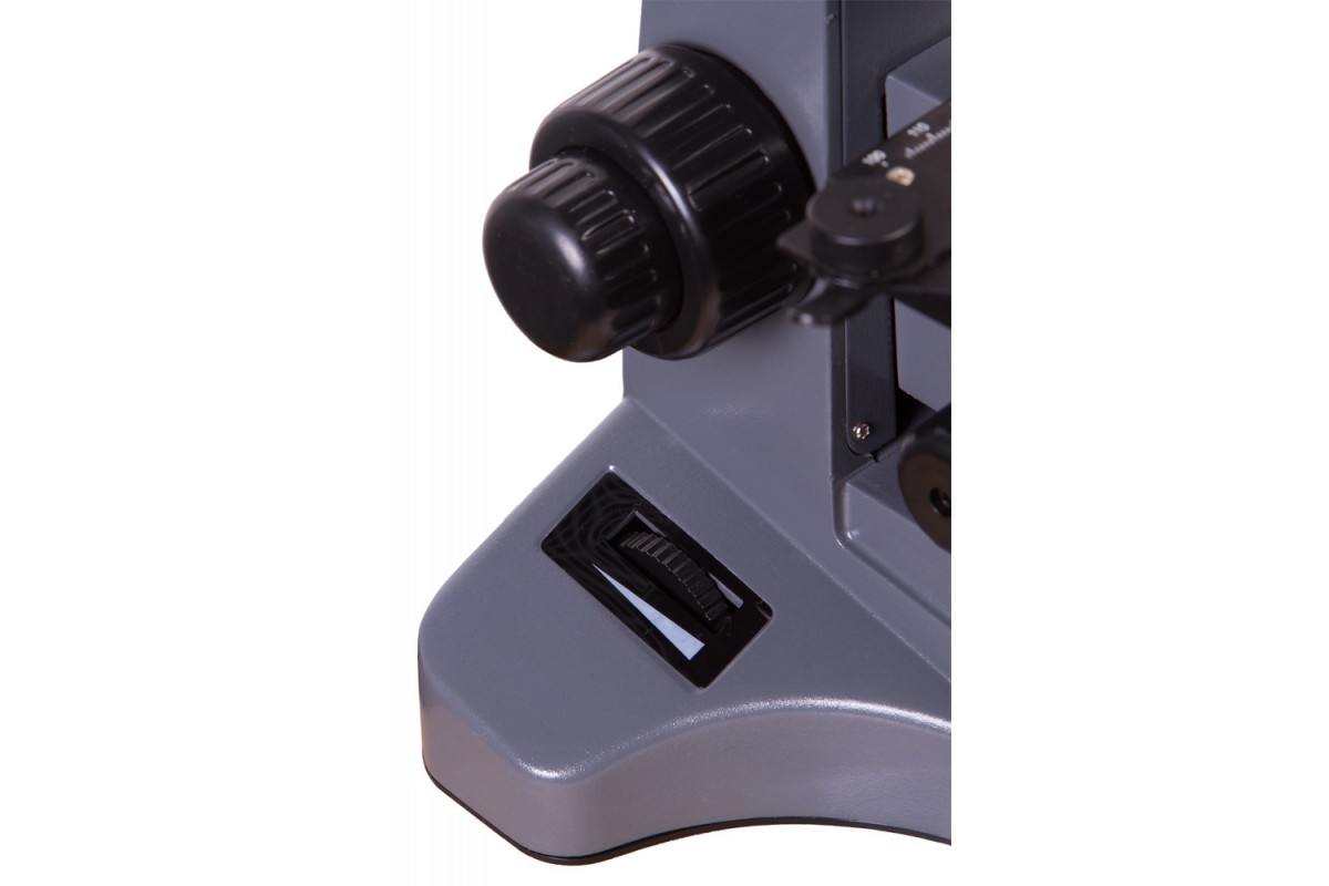 Освещение образцов происходит снизу, поэтому изучать можно только прозрачные препараты. Яркий светодиод направляет луч света через конденсор с ирисовой диафрагмой прямо на область исследований. Яркость подсветки и апертуру конденсора можно регулировать.