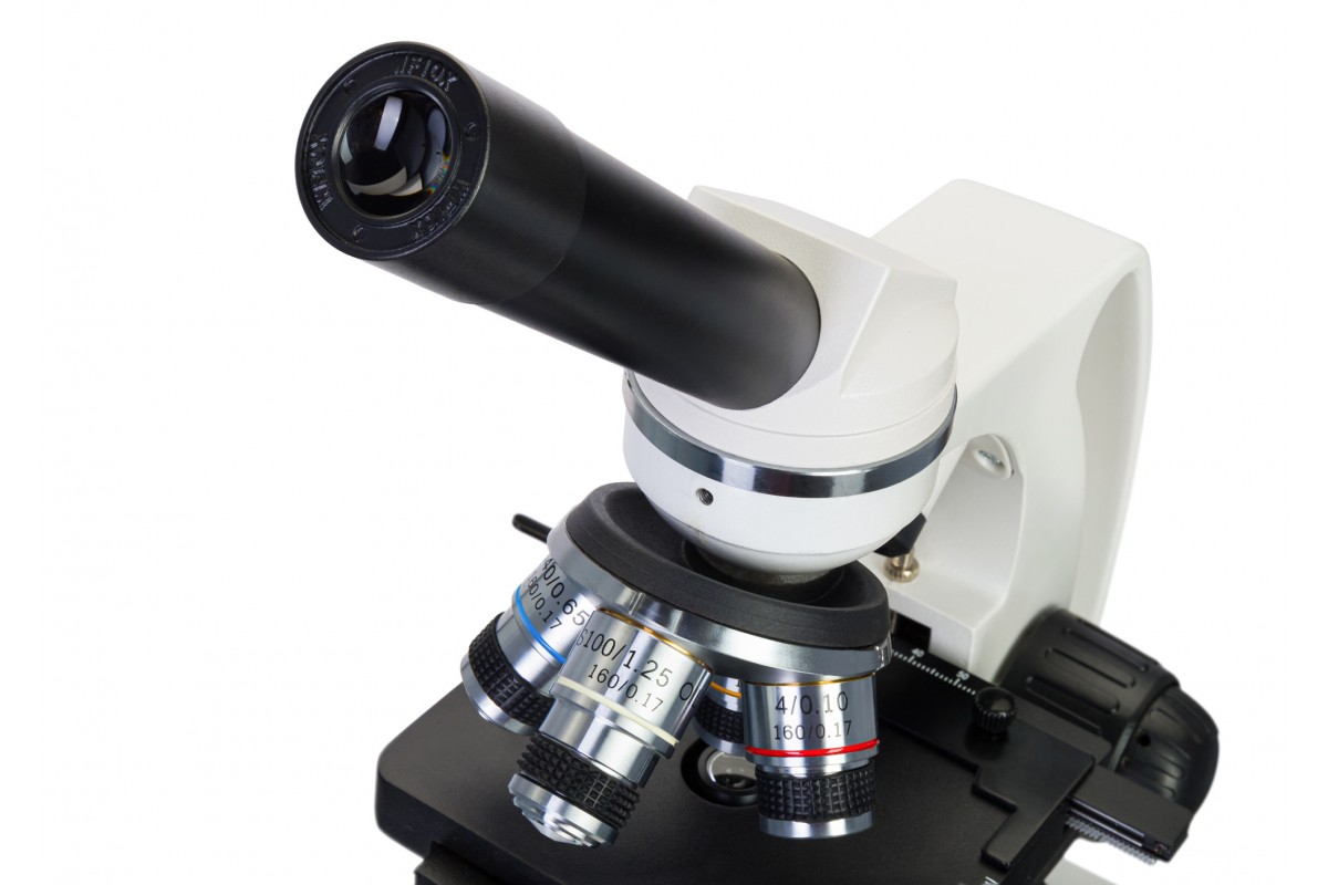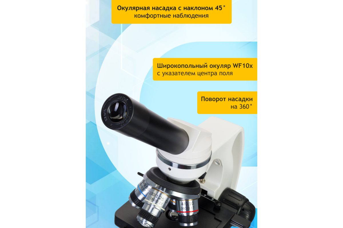Монокулярную насадку можно разворачивать на 360°, что делает наблюдения в группе более удобными. Достаточно повернуть насадку, чтобы показать образец другому исследователю. Также у насадки есть небольшой наклон в 45°. Такое ее положение позволяет долго изучать образцы, не испытывая сильной усталости. Широкопольный окуляр дополнен указателем, объективы ахроматические, причем 40-кратный и 100-кратный имеют пружинящие оправы передней линзы. Объектив 100х поддерживает работу с иммерсионным маслом. Общее увеличение микроскопа составляет от 40 до 1000 крат. Доступна грубая и точная настройка резкости.