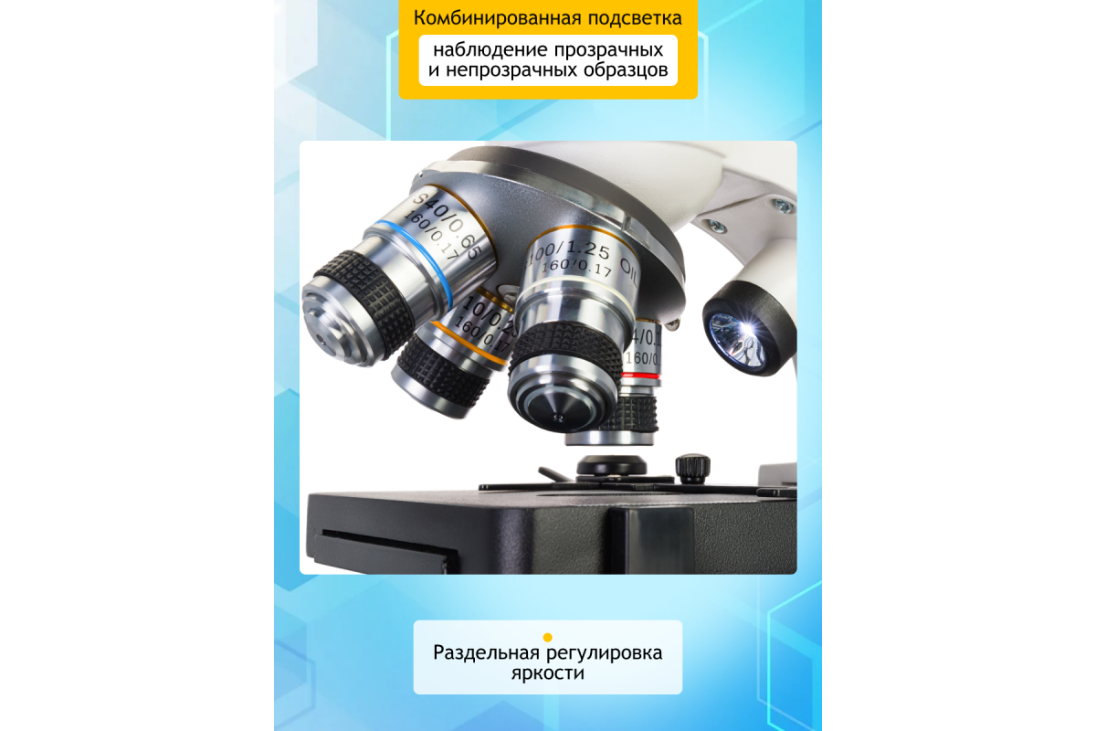 • Увеличение от 40 до 1000 крат, широкопольный окуляр с указателем центра поля