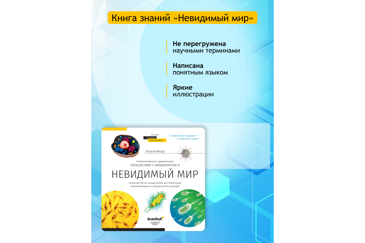 Книга знаний «Невидимый мир» – приятное дополнение к этому микроскопу, так как позволяет мгновенно погрузиться во множество тайн микромира. Это познавательное пособие, рассказывающее о крошечных обитателях окружающего мира, которых можно увидеть при помощи микроскопа. Книга написана «живым» языком, красочно иллюстрирована и дополнена описаниями несложных научных опытов, которые можно провести прямо дома.