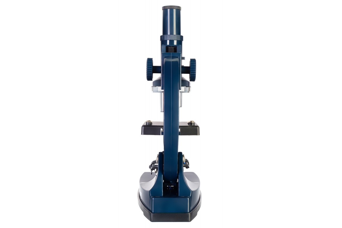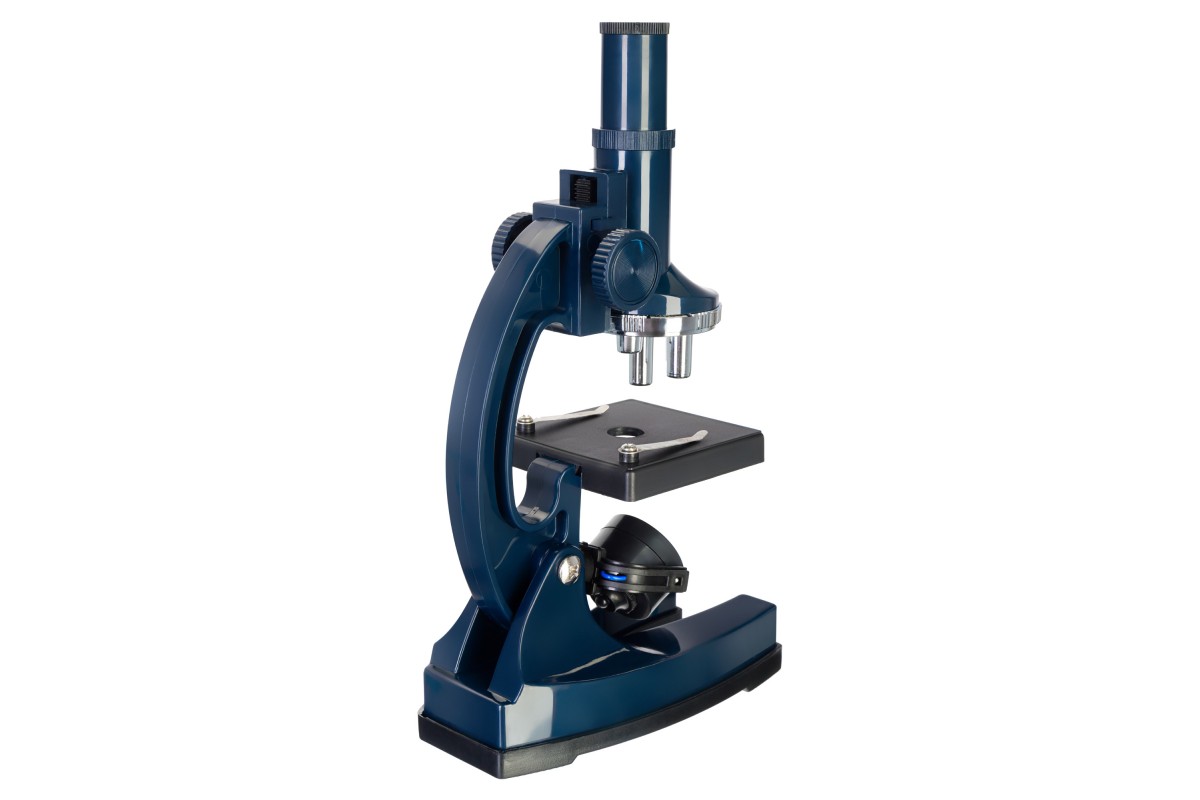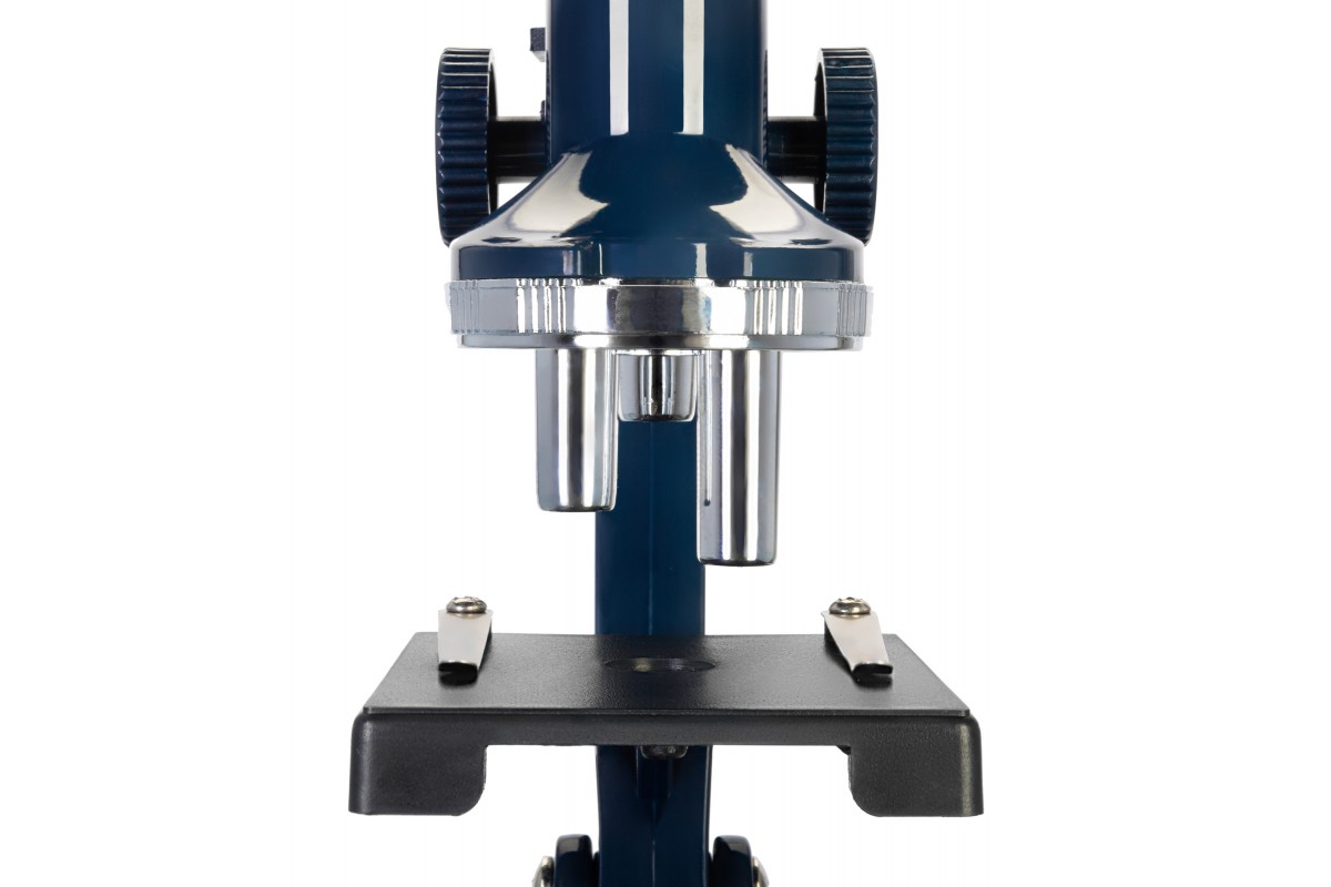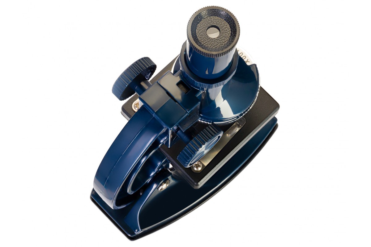 Оптическую систему микроскопа составляют монокулярная насадка и револьверное устройство, вмещающее 3 объектива. Увеличение прибора находится в диапазоне от 100 до 900 крат, что вполне достаточно для большинства базовых исследований микромира. Предметный столик снабжен зажимами и дисковой диафрагмой. Подсветка расположена внизу, она сдвоенная: с одной стороны находится лампочка накаливания, работающая от батареек, а с другой – зеркало, которое позволяет вести наблюдения при естественном освещении.