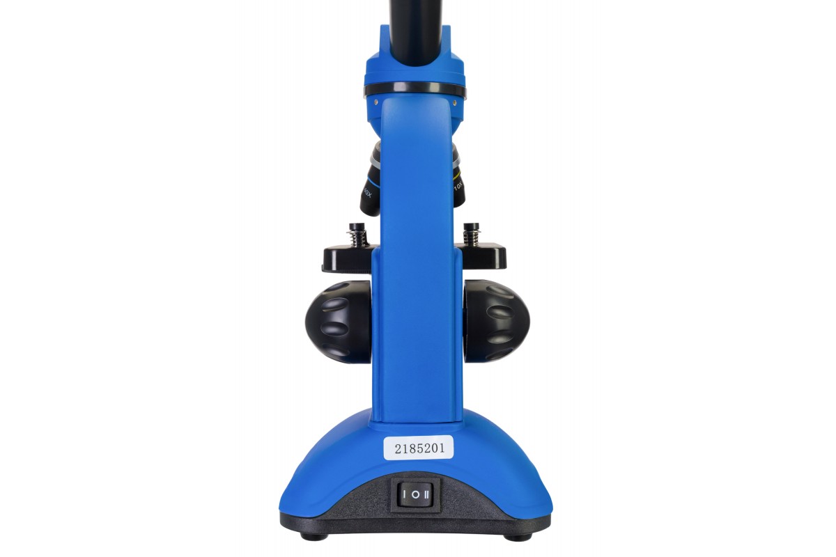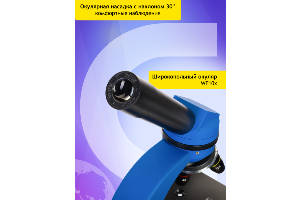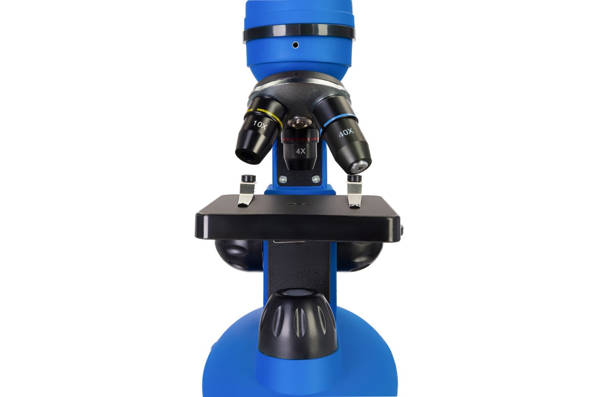Монокулярная насадка наклонена под углом в 30°, поэтому микроскоп удобно использовать для длительных наблюдений. Широкопольный окуляр дает увеличение 10 крат, также в комплектацию включены три ахроматических объектива с кратностью 4х, 10х и 40х. 40-кратный объектив имеет пружинящую оправу, защищающую переднюю линзу от механических повреждений. Линзы оптической системы сделаны из стекла, поэтому передаваемая картинка получается четкой и контрастной.