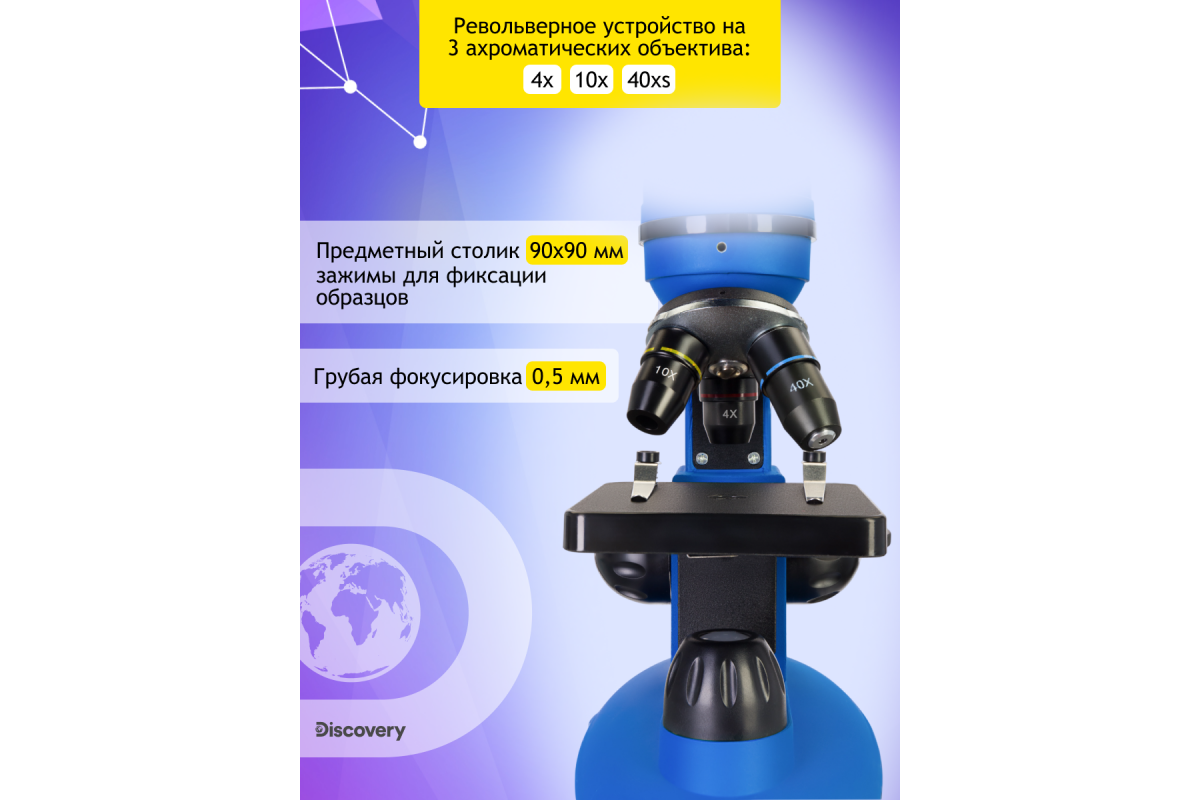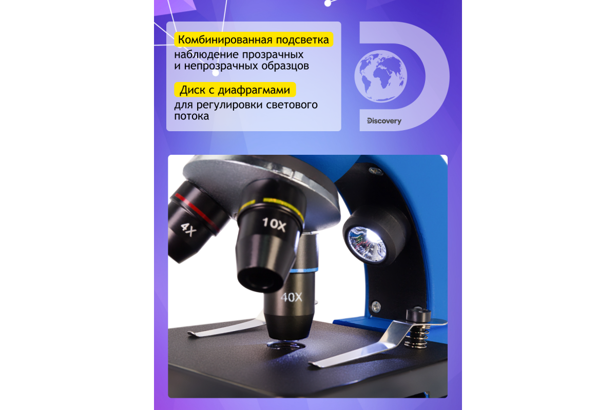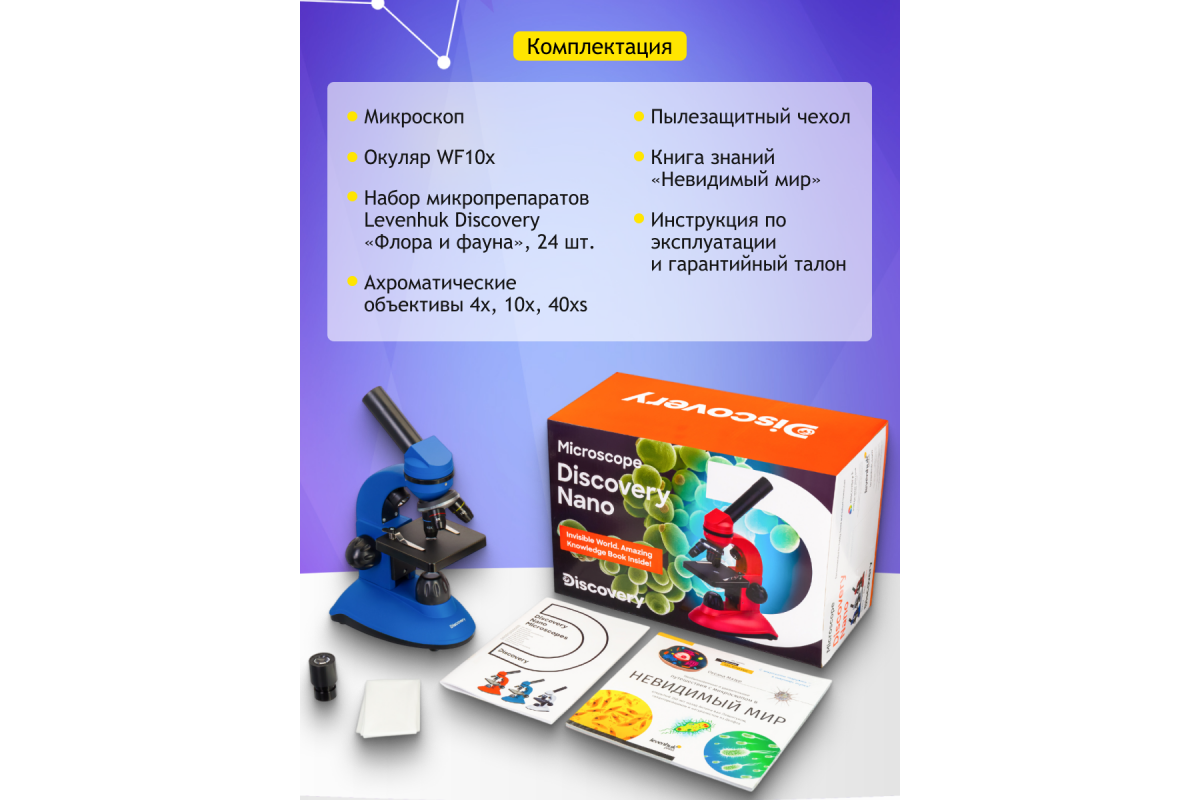 Важная особенность микроскопа – в комплекте вы найдете набор микропрепаратов Levenhuk Discovery «Флора и фауна», состоящий из 24 готовых образцов.