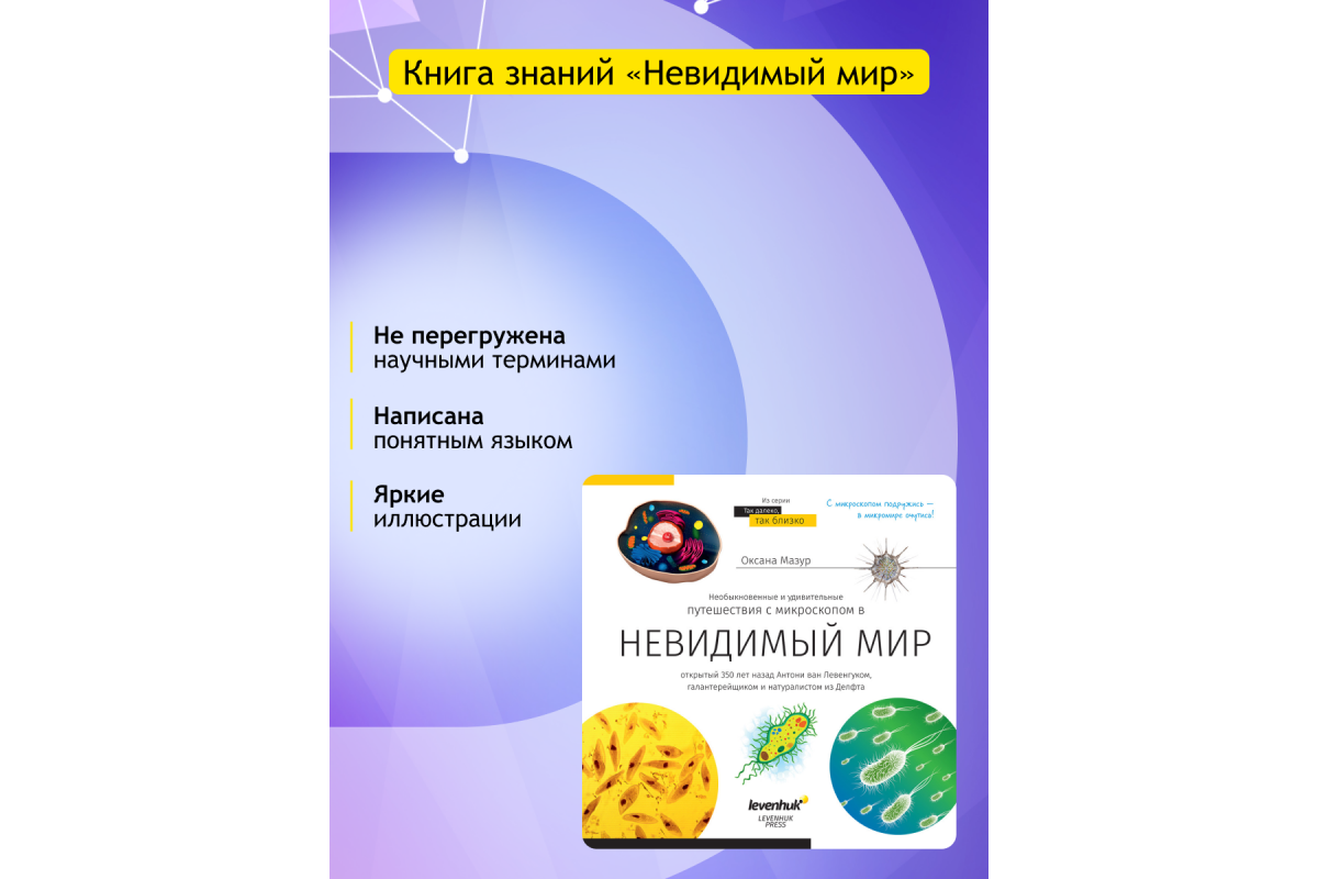 Книга знаний «Невидимый мир» станет прекрасным подспорьем в самом начале работы с микроскопом. Она рассказывает о том, как устроен микроскоп, как выглядят обитатели микромира, какие научные опыты можно провести дома самостоятельно. С ее помощью будет проще освоить управление микроскопом и провести первые исследования.