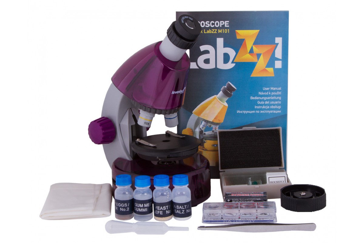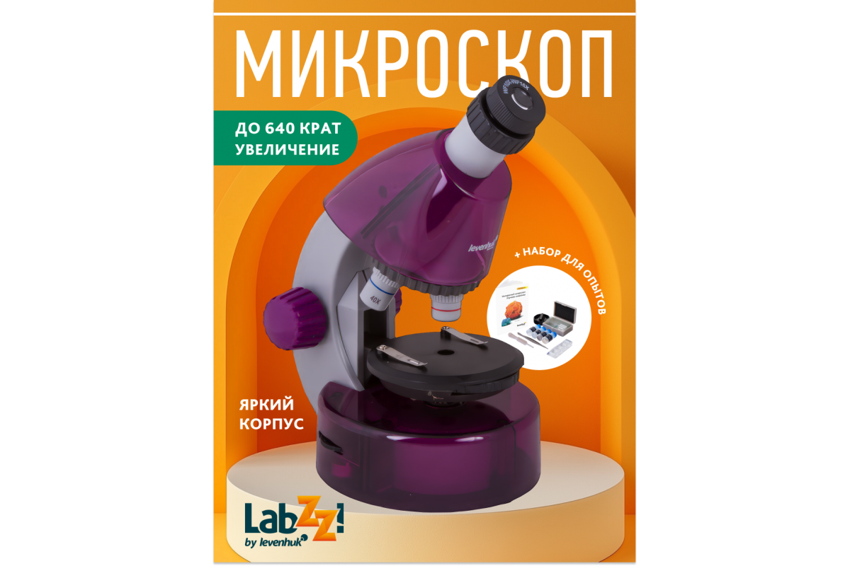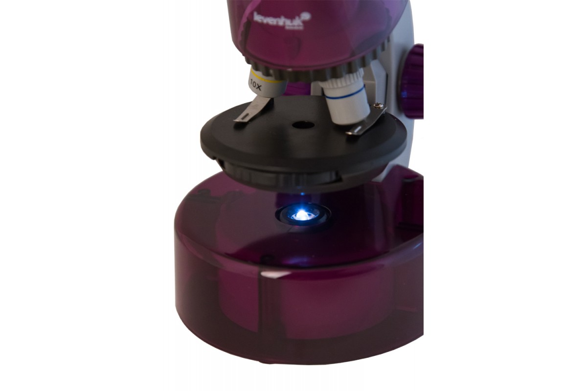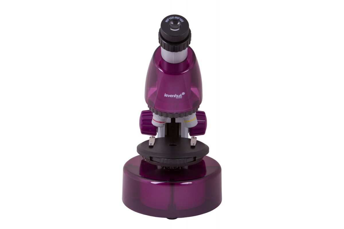 Яркий микроскоп Levenhuk LabZZ 101 Amethyst\Аметист станет прекрасным подарком для любознательного ребенка! С его помощью маленький исследователь сможет открыть множество удивительных тайн микромира. В комплекте есть все, что нужно для проведения первых опытов с микроскопом. Кроме того, микроскоп отличается оригинальным внешним видом – он изготовлен в ярко-фиолетовом полупрозрачном корпусе необычный формы.