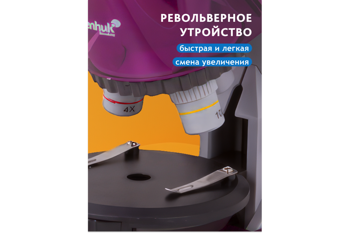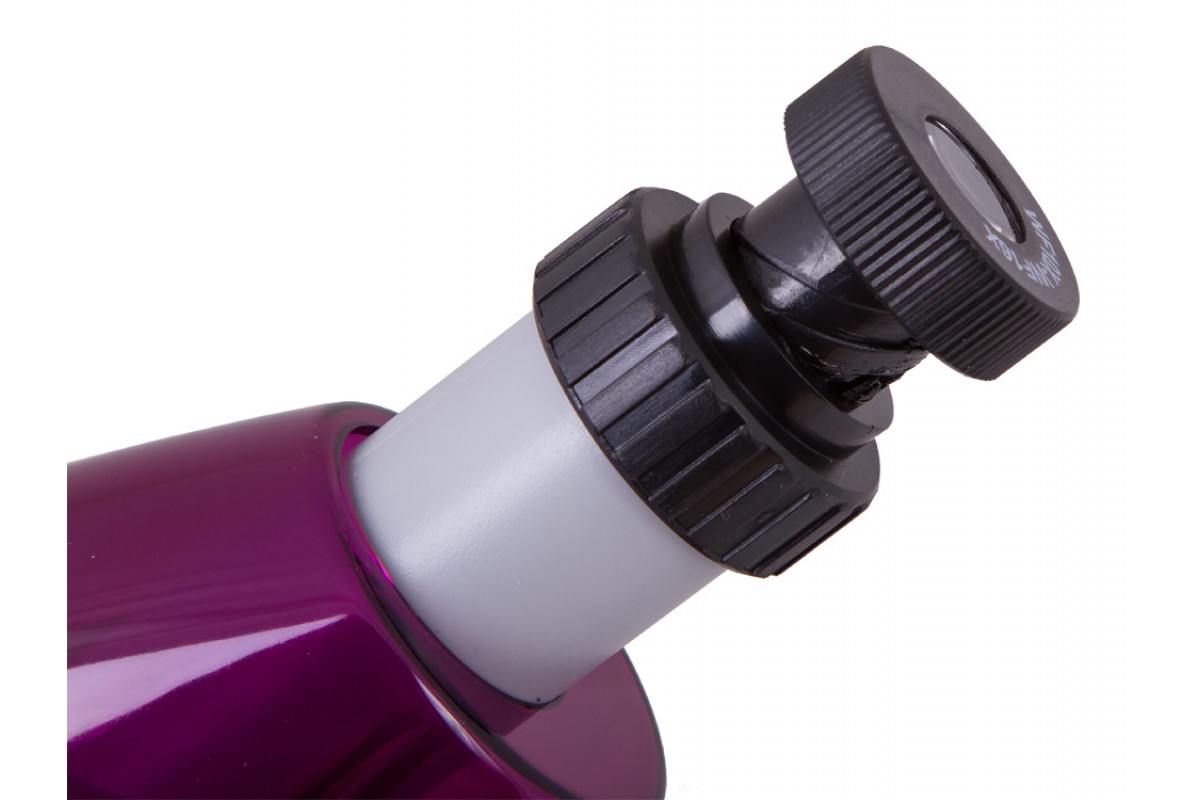 Levenhuk LabZZ 101 Amethyst\Аметист – это детский микроскоп, который по уровню оптики вполне сопоставим со многими «взрослыми» моделями. Три объектива установлены в удобном револьверном устройстве – оно позволяет сменить объектив, не прерывая наблюдений. Особенность этой модели – выдвижной окуляр, способный заменить два обычных окуляра с кратностью 10x и 16x. Ребенку не придется менять окуляры, так что они не потеряются. Окуляр и три объектива обеспечивают увеличения 40, 64, 100, 160, 400 и 640 крат.