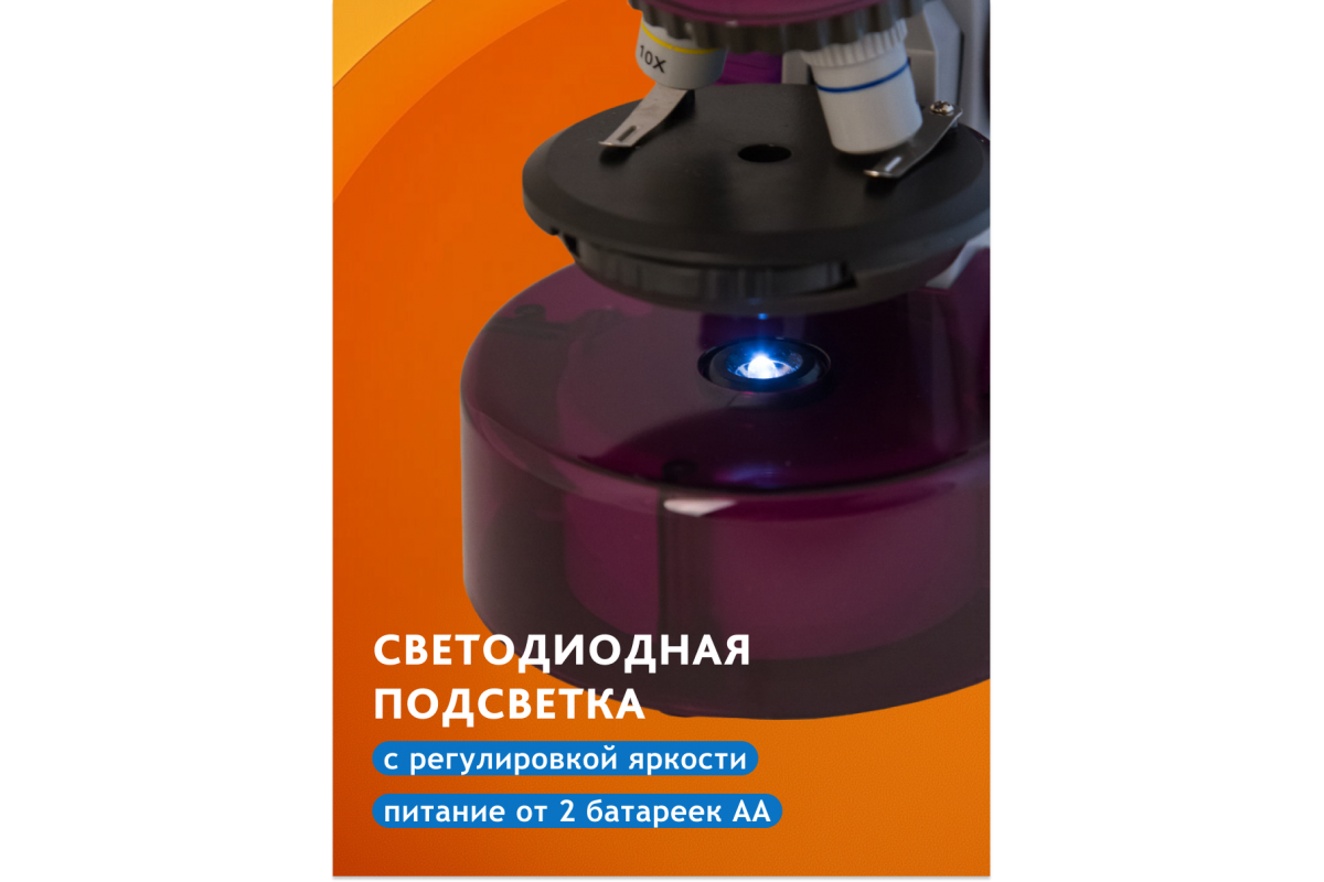 Корпус изготовлен из прочного пластика, и микроскоп получился одновременно легким и надежным – то, что нужно для ребенка. Для комфортного использования окулярная насадка наклонена под углом 45°. Микроскоп питается не от сети, а от стандартных батареек – это безопаснее и удобнее.