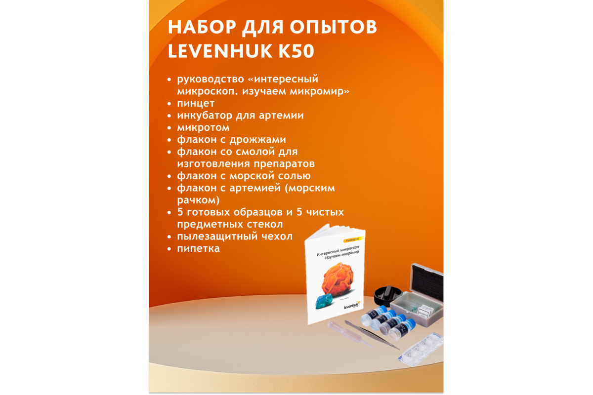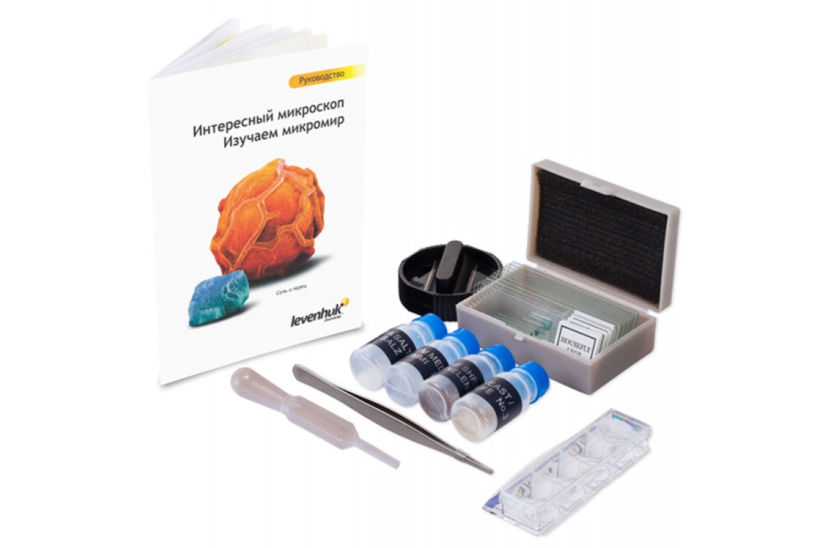 В комплект входит набор для опытов, в котором есть готовые препараты, специальные инструменты для работы с микроскопическими образцами и руководство с полезной информацией об устройстве микроскопа и рекомендациями по работе с ним.