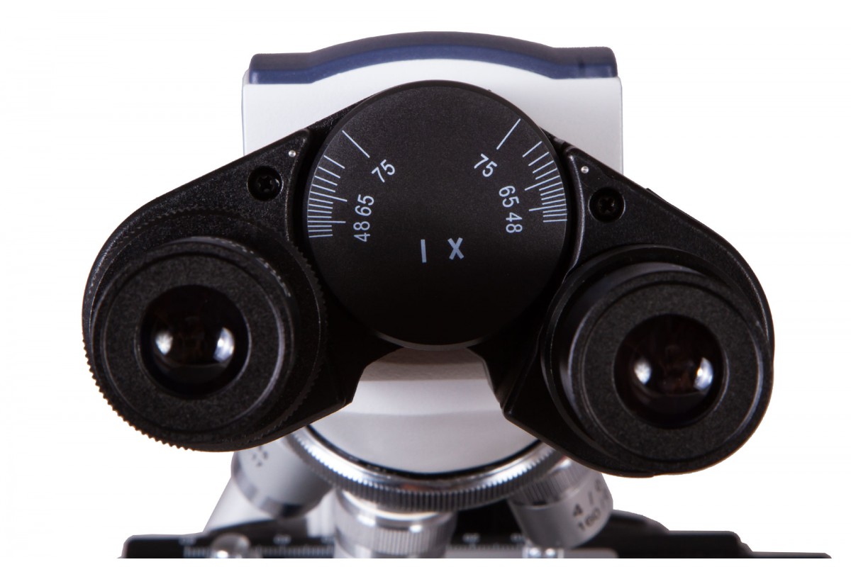 Бинокулярная насадка имеет наклон в 30°, поэтому микроскоп удобно использовать для длительных исследований образцов. Насадка вращается на 360°, при необходимости ее можно развернуть в любую сторону. Ахроматическая оптика имеет антигрибковое покрытие. В комплект поставки включены два широкопольных окуляра с диоптрийной коррекцией и четыре объектива с разным увеличением. Пружинящие оправы есть у двух объективов – 40-кратного и 100-кратного. 100-кратный объектив можно использовать для наблюдений с применением масляной иммерсии (флакон с маслом в комплекте). Настроить резкость можно при помощи ручек грубой и точной фокусировки.
