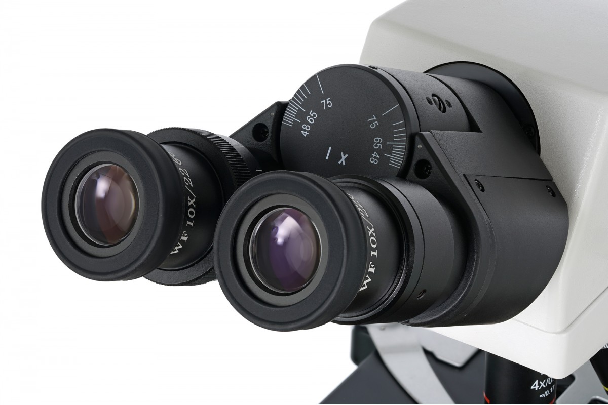 Бинокулярную насадку можно поворачивать на 360°. Небольшой 30-градусный наклон визуальной части делает длительные наблюдения более комфортными – мышцы шеи и плечевого пояса меньше устают. Оптическая система состоит из двух широкопольных окуляров и четырех фазовых объективов (в револьверное устройство можно устанавливать одновременно пять объективов). Все оптические поверхности защищены антигрибковым покрытием. Есть диоптрийная коррекция и две настройки резкости – грубая и точная. Общее увеличение микроскопа составляет от 40 до 1000 крат. Объективы 40х и 100х имеют пружинящие оправы, для наблюдений с применением масляной иммерсии используется 100-кратный объектив.