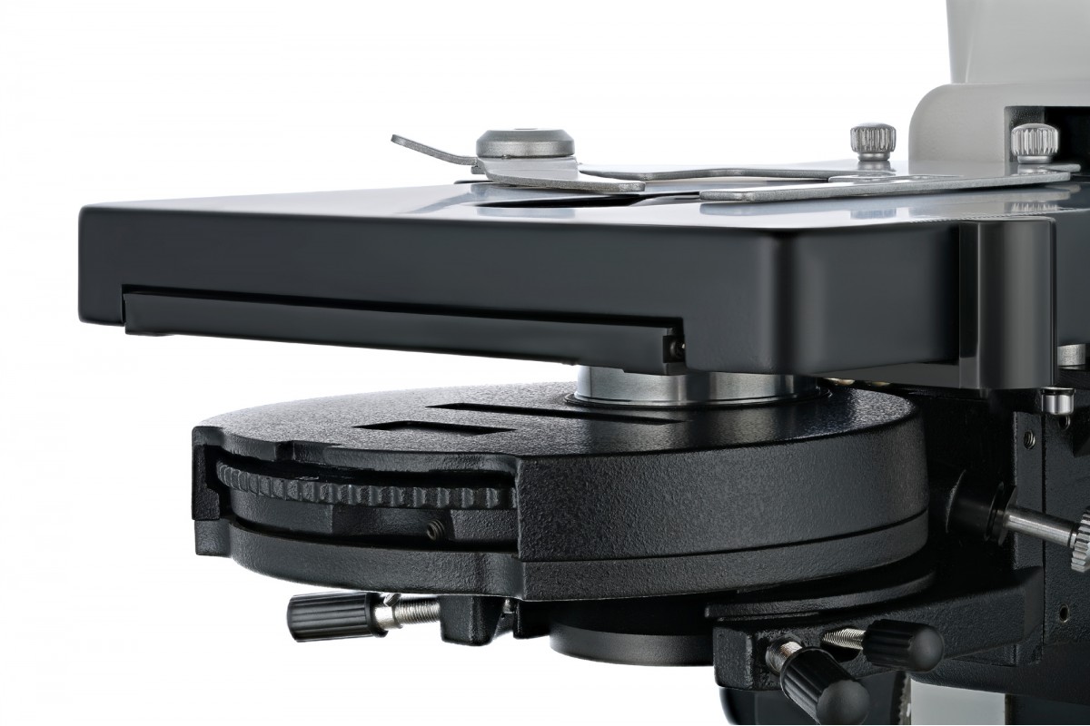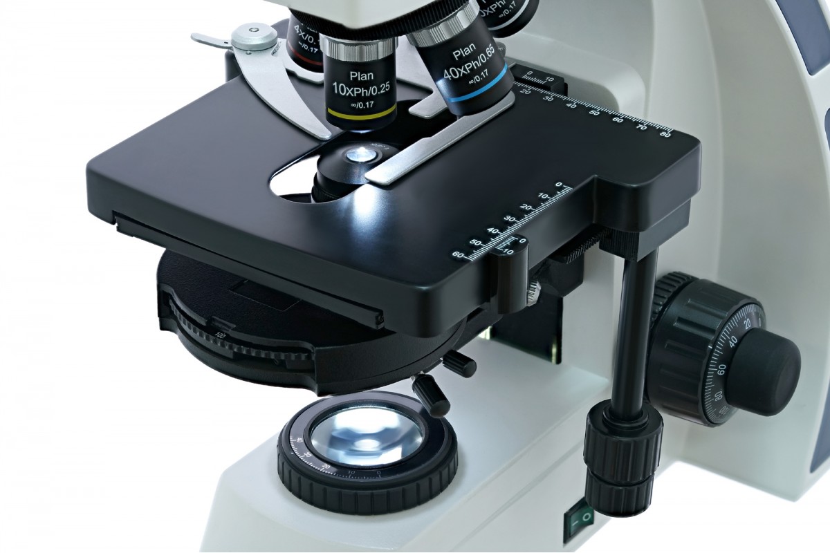 У предметного столика есть препаратоводитель. С его помощью можно быстро разместить микропрепарат под объективом микроскопа. Столик перемещается по двум направлениям, под ним находится фазовый конденсор. В специальный держатель можно устанавливать фильтры для увеличения контрастности и детализации передаваемого изображения. Источник освещения – классическая светодиодная подсветка с регулировкой яркости. Возможна настройка освещения по методу Келера.