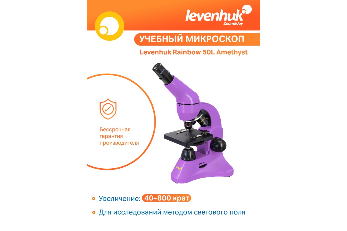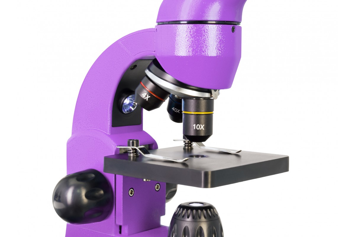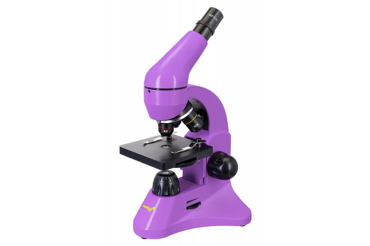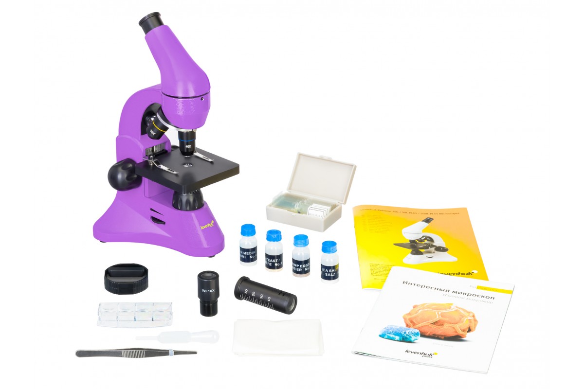 Современный микроскоп Levenhuk Rainbow 50L Amethyst\Аметист – простой способ увлечь ребенка учебой. С помощью этого микроскопа юный исследователь узнает, из чего состоят растения, как устроены животные, почему мухи могут ходить по стенам и многое другое! В комплект входит набор для опытов, в котором есть все необходимое для начинающего биолога. Яркий фиолетовый корпус привлекает внимание – этот микроскоп станет отличным подарком!