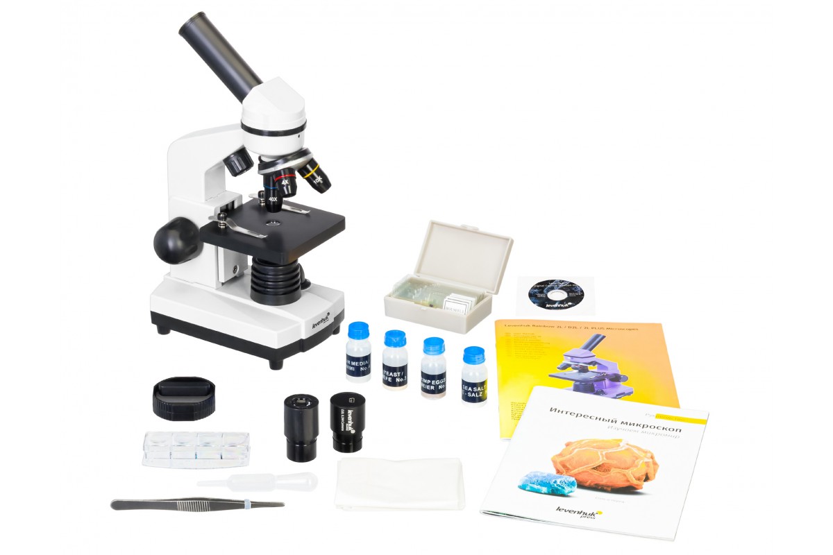 В комплект входит набор Levenhuk K50, в котором есть все, что нужно для проведения интересных опытов с микроскопом. Набор содержит готовые препараты, инструменты для работы с микроскопическими образцами и подробное руководство с описаниями экспериментов.