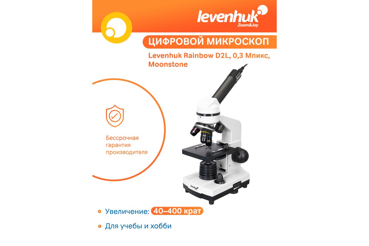 Современный микроскоп LevenhukRainbow D2L Moonstone\Лунный камень станет идеальным подарком для школьника – любителя биологии. С его помощью юный исследователь узнает, как устроены окружающие предметы, из чего состоят растения и животные, кто живет в воде из аквариума, и многое другое! В комплект входит цифровая камера, поэтому делиться результатами своих исследований с друзьями очень просто – достаточно отправить красивую фотографию микропрепарата по электронной почте или опубликовать интересный ролик на YouTube.