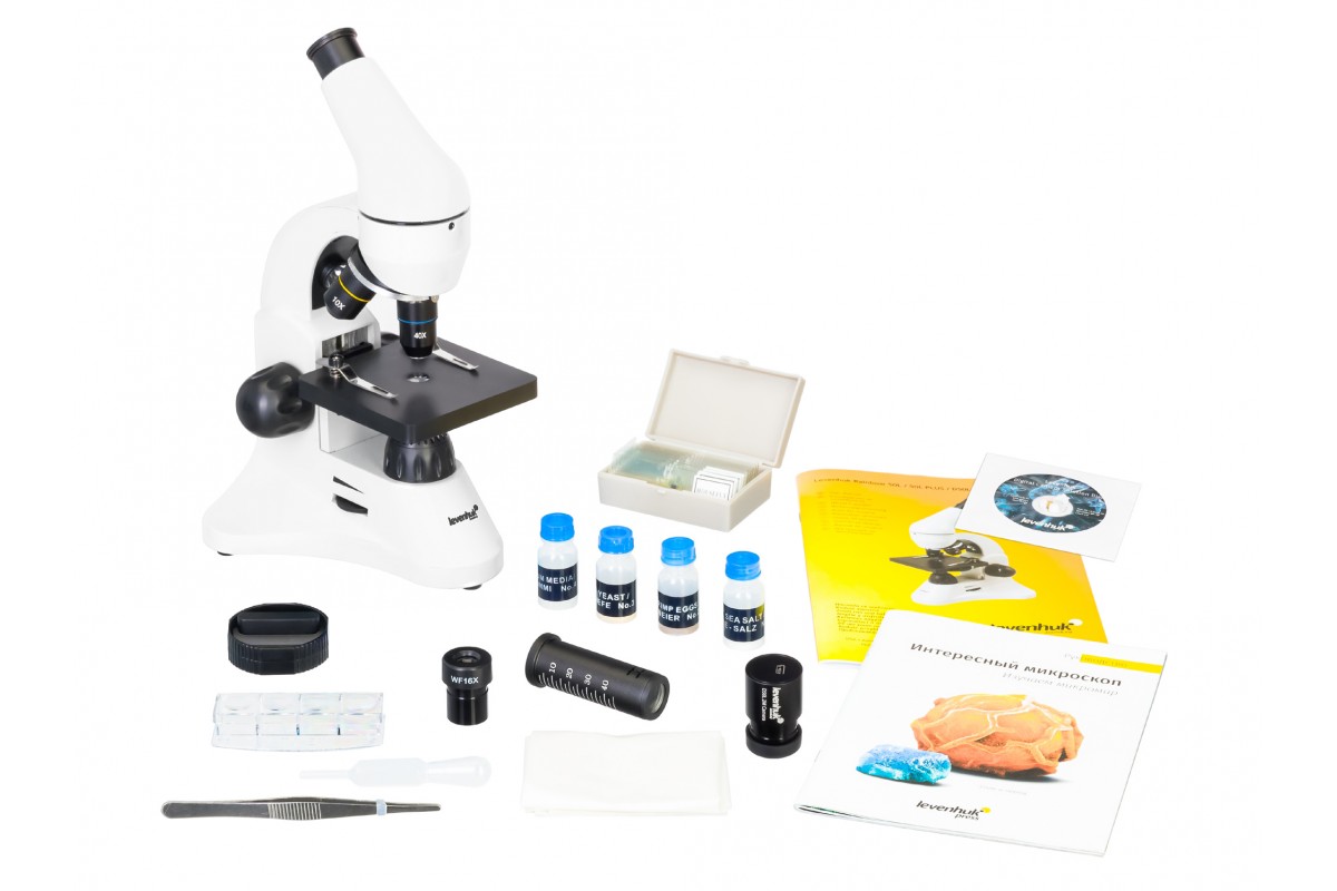 В комплект входит набор для опытов LevenhukK50, в котором есть все, что нужно начинающему биологу. Набор содержит готовые препараты, инструменты создания собственных образцов для изучения и руководство с полезными советами и писаниями экспериментов.
