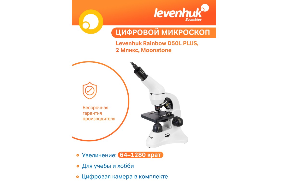 Стильный и современный микроскоп Levenhuk Rainbow D50L PLUS Moonstone\Лунный камень станет прекрасным подарком для любознательного подростка, студента-биолога или сотрудника лаборатории. Микроскоп подходит как для простых опытов, так и для серьезных исследований. В комплект входит качественная цифровая камера, с помощью которой легко фиксировать результаты своей работы и делиться новыми открытиями с друзьями и коллегами. Чтобы похвастаться своими достижениями, достаточно просто опубликовать красивую фотографию микропрепарата в соцсетях.