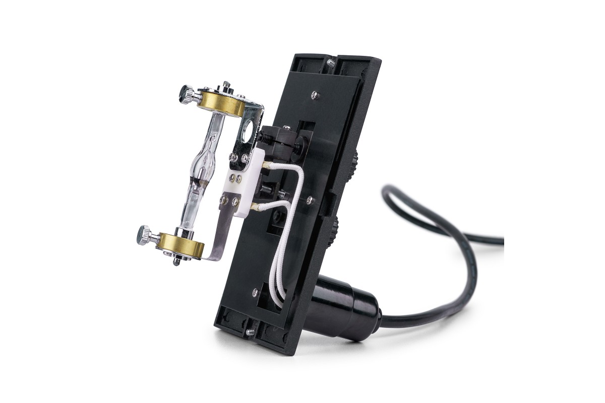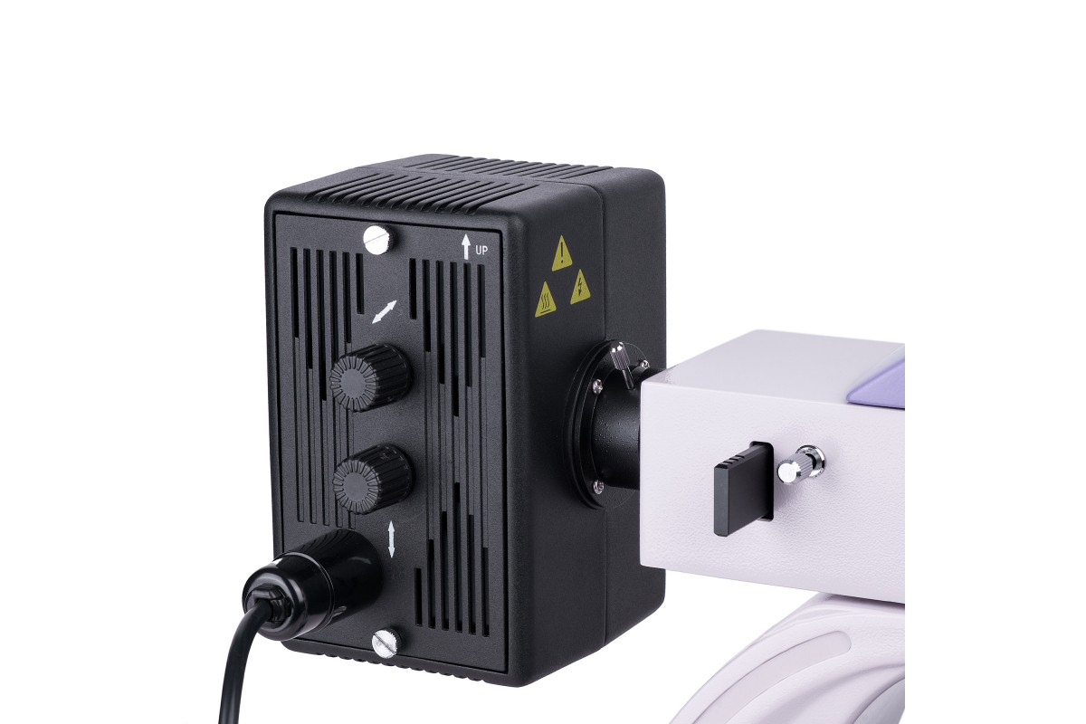 В осветителе проходящего света стоит 30-ваттная галогенная лампа. Галогенная лампа излучает свет, комфортной для глаз цветовой температуры. 30-ваттная лампа светит достаточно ярко для работы на объективах увеличением от 4х до 100х.