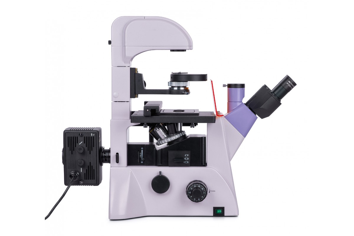 В осветителе проходящего света стоит 30-ваттная галогенная лампа. Галогенная лампа излучает свет, комфортной для глаз цветовой температуры. 30-ваттная лампа светит достаточно ярко для работы на всех объективах по методу светлого поля и фазового контраста.