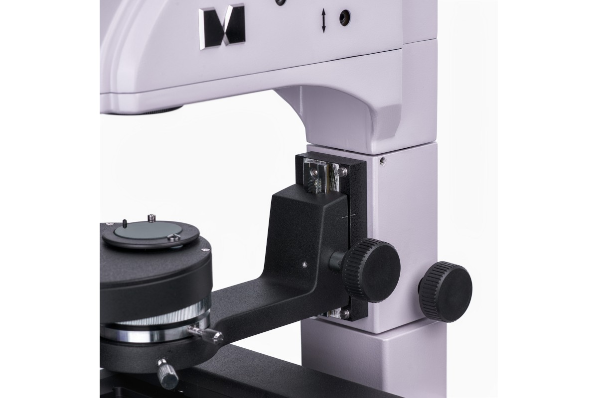На неподвижный предметный столик установлен специальный механизм для перемещения лабораторной посуды в двух взаимоперпендикулярных направлениях. Плавное тонкое перемещение объекта обеспечит точность исследований – ни один участок исследуемого объекта не будет пропущен. Ручка перемещения низкая, поэтому пользователь не напрягает кисть правой руки. В комплект микроскопа входят три держателя чашек под разные размеры посуды.