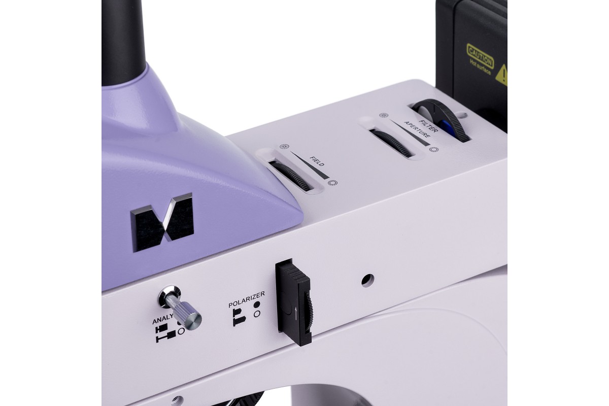 Микроскоп оборудован встроенным анализатором и съемным поляризатором. Поляризатор вращается в диапазоне 0–360°, анализатор не вращается. При помощи апертурной диафрагмы и полевой диафрагмы настраивается освещение по методу Кёлера. Обе диафрагмы и источник света центрируются. Есть набор светофильтров. Устройство для работы по методу темного поля встроено в насадку осветителя отраженного света.